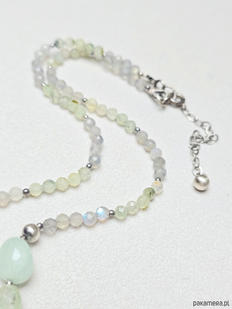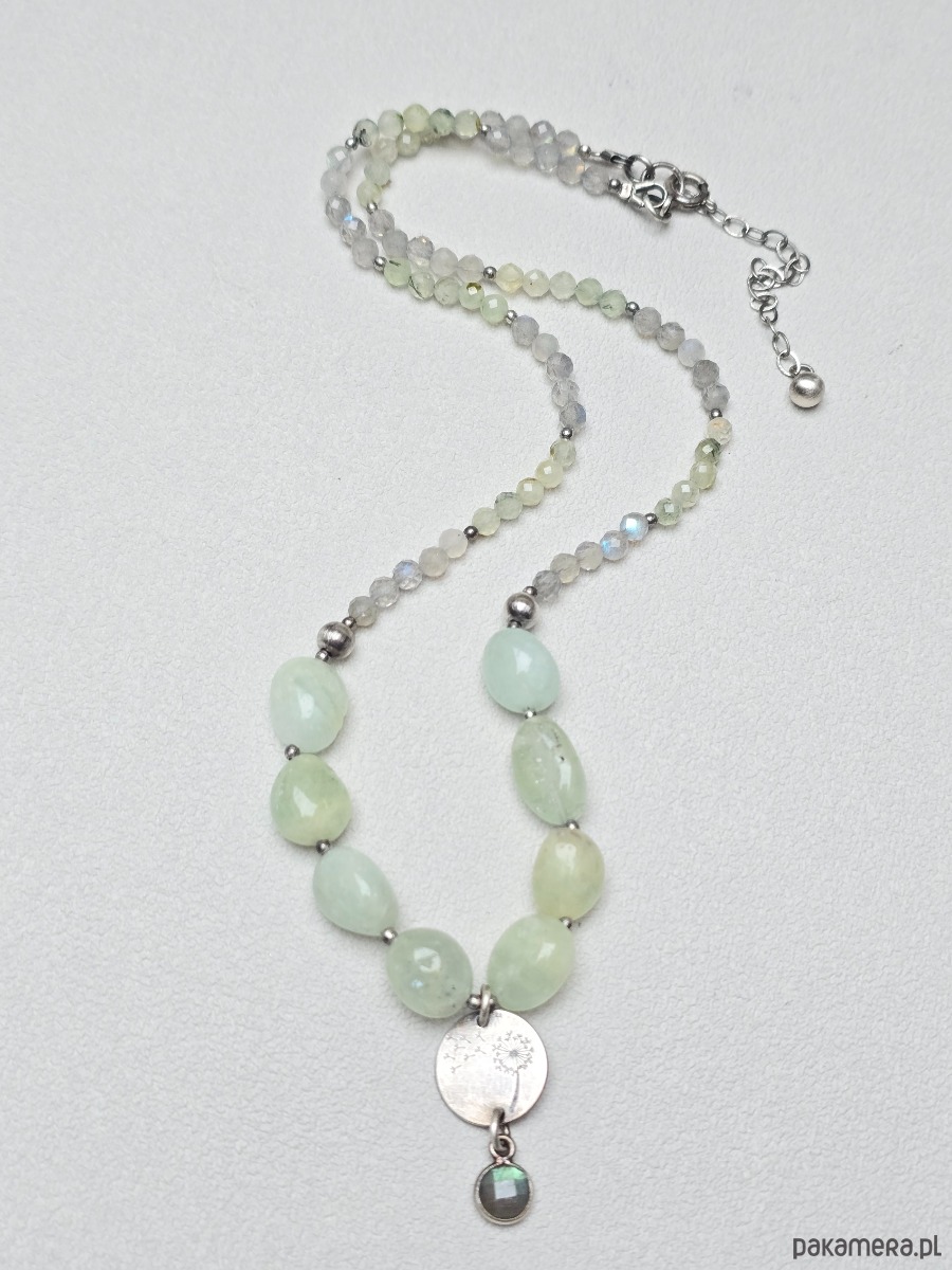 Naszyjnik z kamieni naturalnych tj.: prehnit, labradoryt i zielony morganit. Ozdobą naszyjnika jest centrycznie umieszczona zawieszka z motywem dmuchawca oraz mała z labradorytu