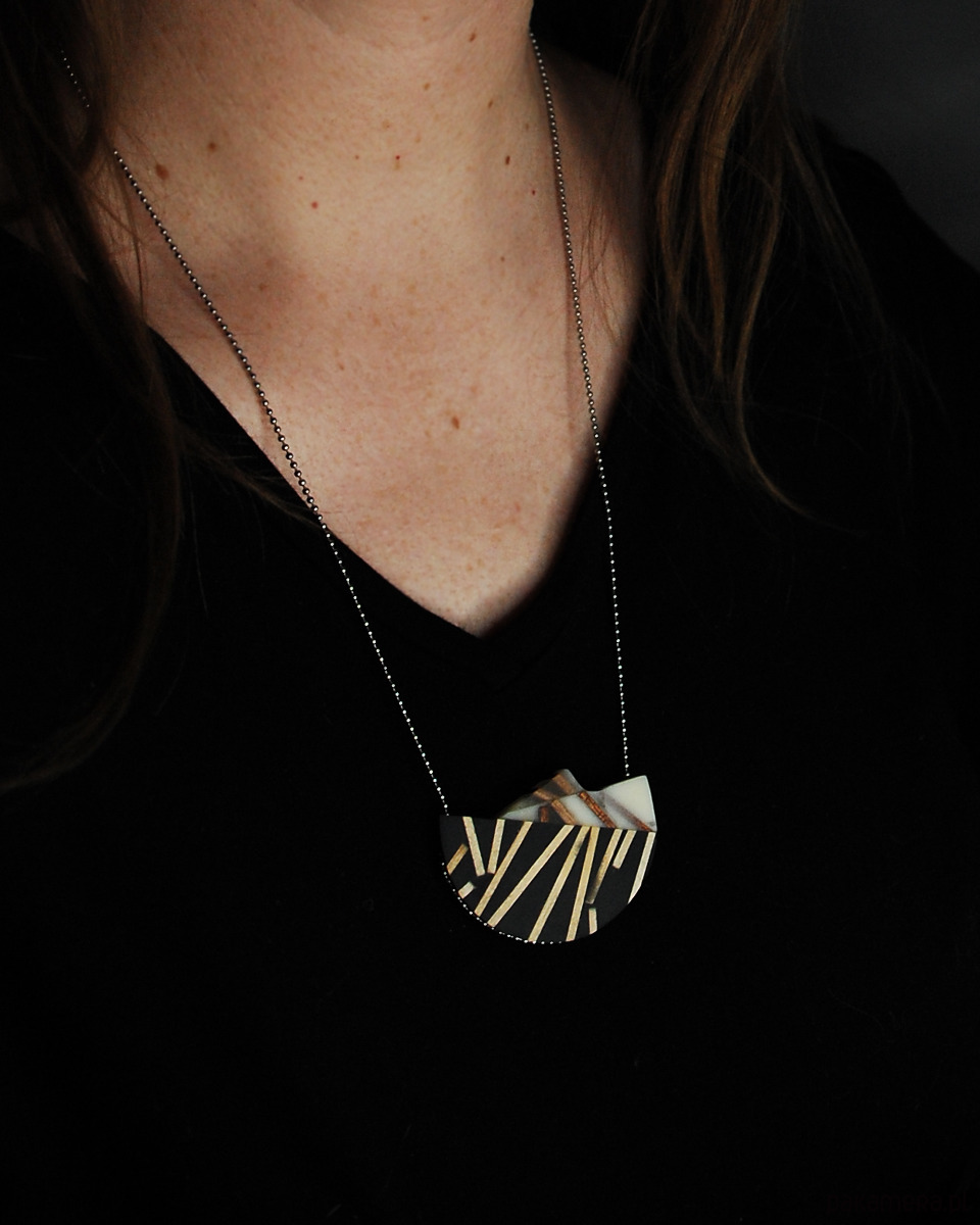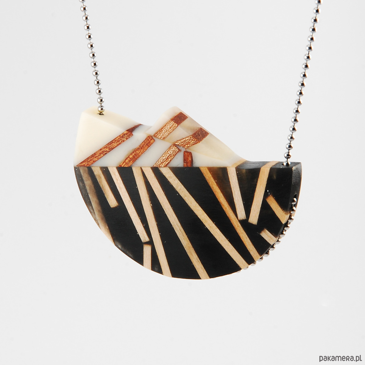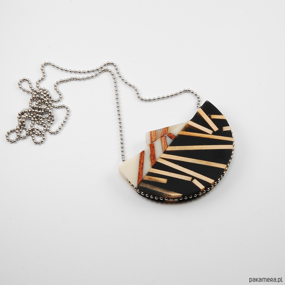 Wyjątkowy naszyjnik wykonany z drewna sapeli i lipy zatopionego w żywicy jubilerskiej. Paski drewna ułożone są na powierzchni naszyjnika w unikatowy abstrakcyjny wzór. Wymiary: 40x56mm i długość całkowita łańcuszka 60cm (stal chirurgiczna)