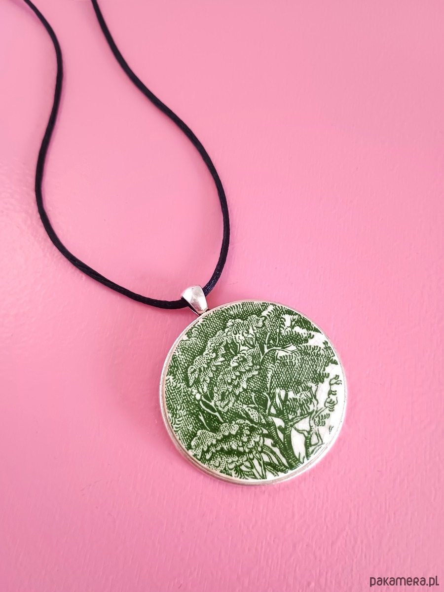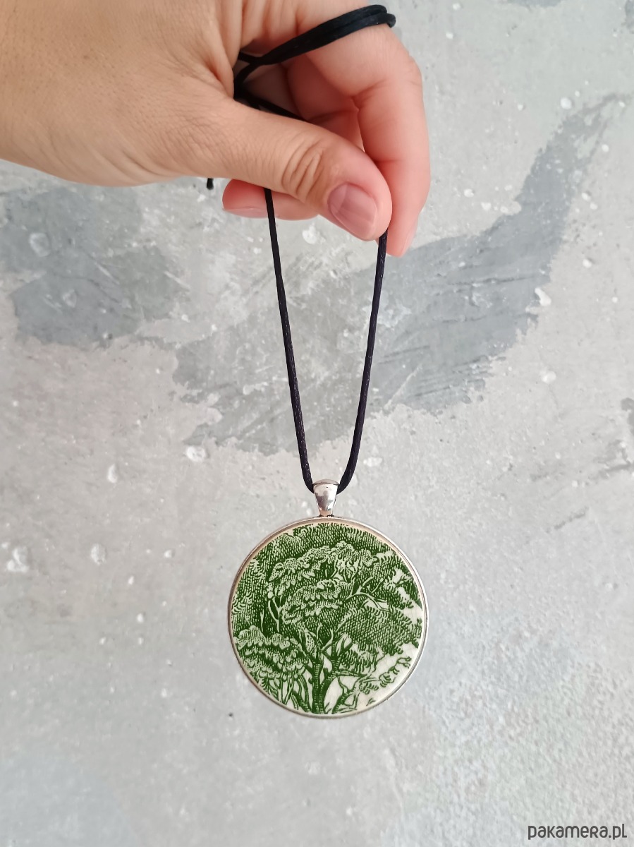 Wyjątkowy naszyjnik, który wykoanałam z fragmentu stłuczonego talerza z fajansu angielskiego w zielone wzory z motywem drzewa. Fragment oszlifowałam w okrągły kształt i osadziłam w metalowej bazie w kolorze srebrnym. Ceramikę zeszlifowałam również z grubości - jest cieńsza niż pierwotnie, dzięki czemu wisior nie jest masywny. Brzegi pokryłam lakierem, co sprawia, że nie brudzą się i nie chłoną wilgoci. Do zawieszki dobrałam satynowy sznureczek w kolorze czarnym. Średnica elementu ceramicznego: 45 mm. Długość sznureczka w całości: ok. 80 cm (naszyjnik zakłada się przez głowę). Sznurek łatwo skrócić lub dobrać swój ulubiony rzemień lub łańcuszek. Upcykling - nie reprodukuję wykorzystywanych wzorów, niczego nie domalowuję - wykorzystuję wyłącznie oryginalne naczynia i motywy, które się na nich znajdują. Tym samym, stłuczce z odzysku nadaję nowe życie.