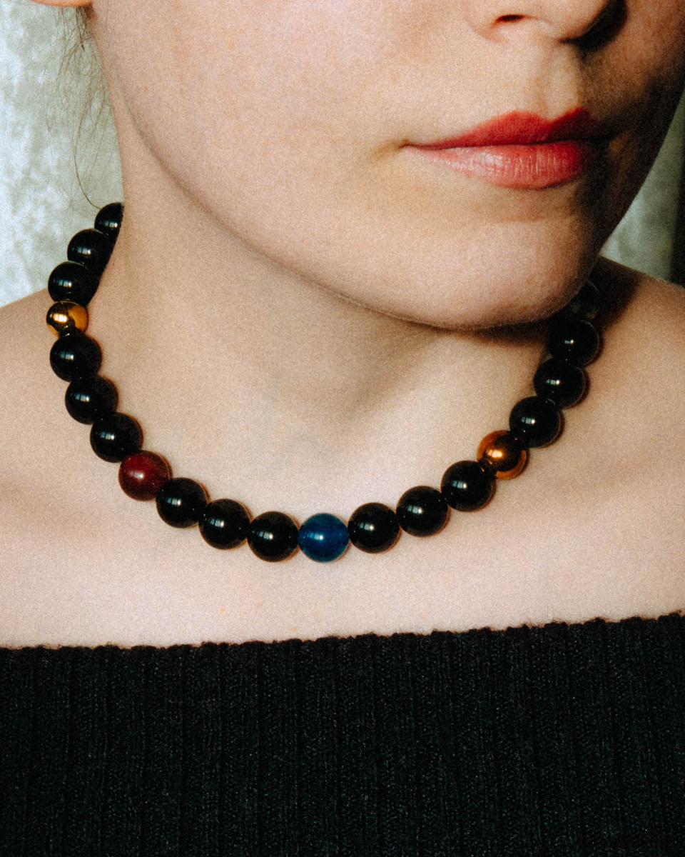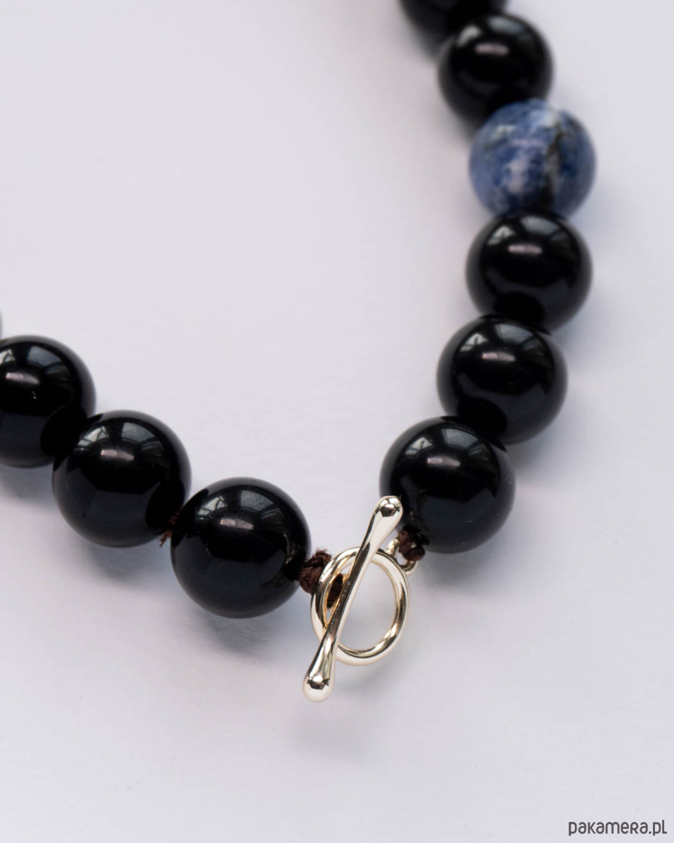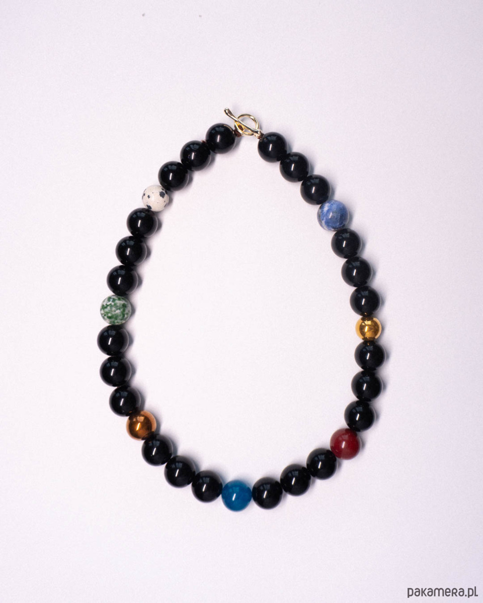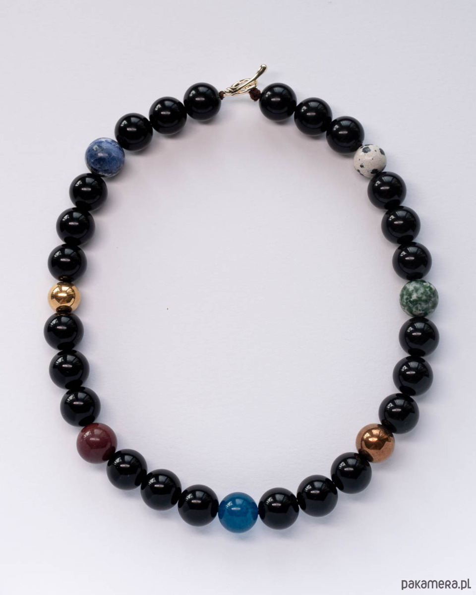 Naszyjnik z dużych kamieni - onyksu, jaspisu, sodalitu, jadeitu oraz hematytu. Zapięcie typu toggle - gold filled (mosiądz złocony).