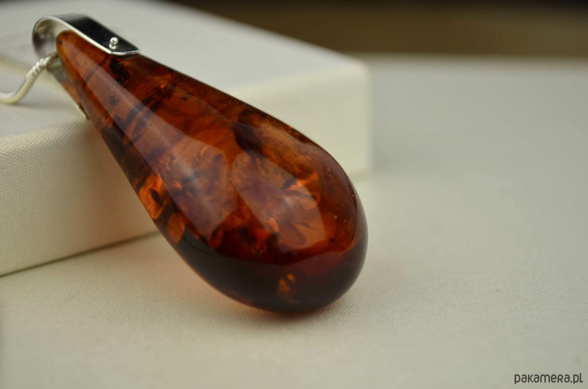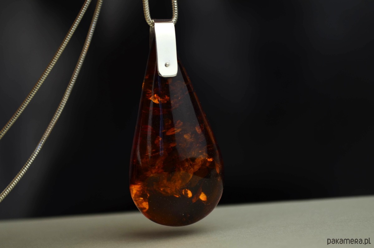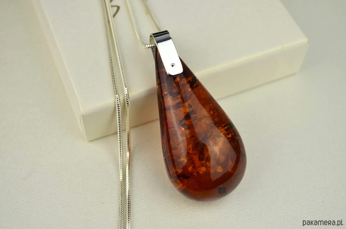 Duża koniakowa kropla bursztynu na nowoczesnym srebrnym łańcuszku- to prosty i efektowny naszyjnik dla miłośniczek złota Bałtyku. Bursztyn pięknie przepuszcza światło i jest pełen połyskujących w środku łusek.