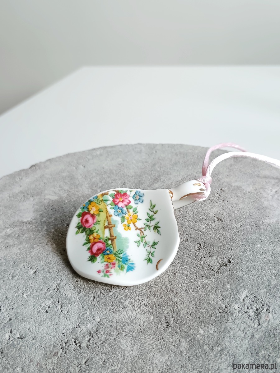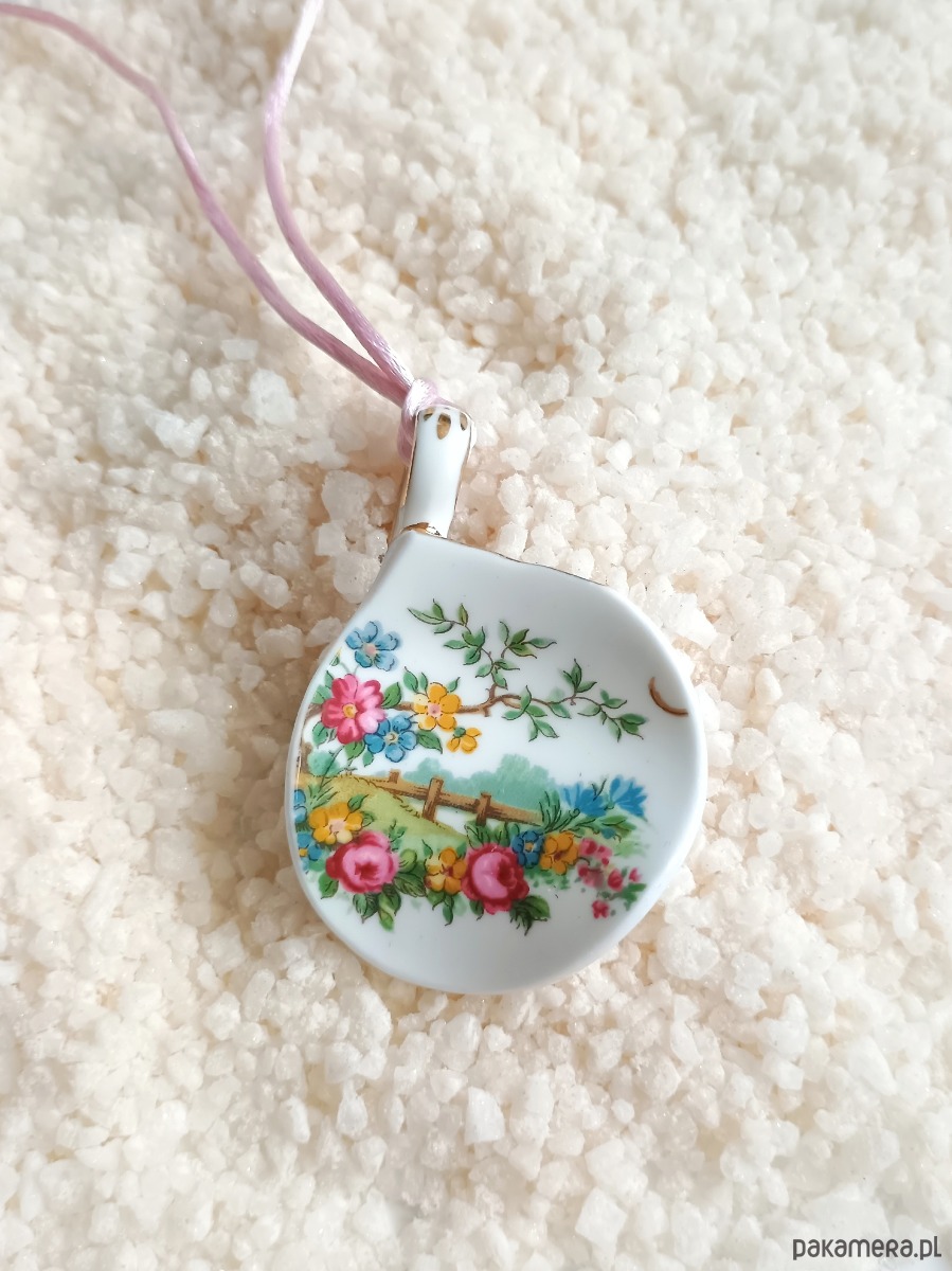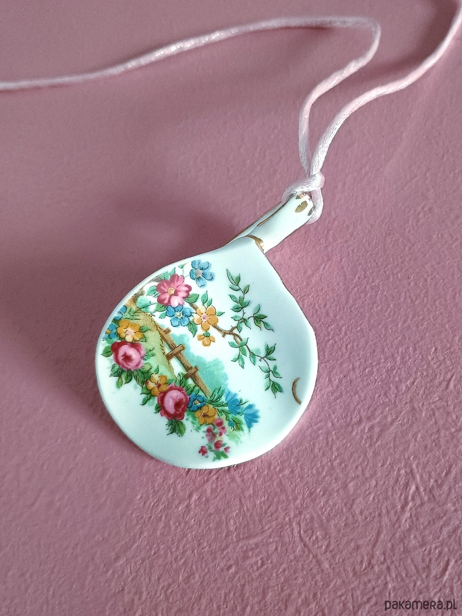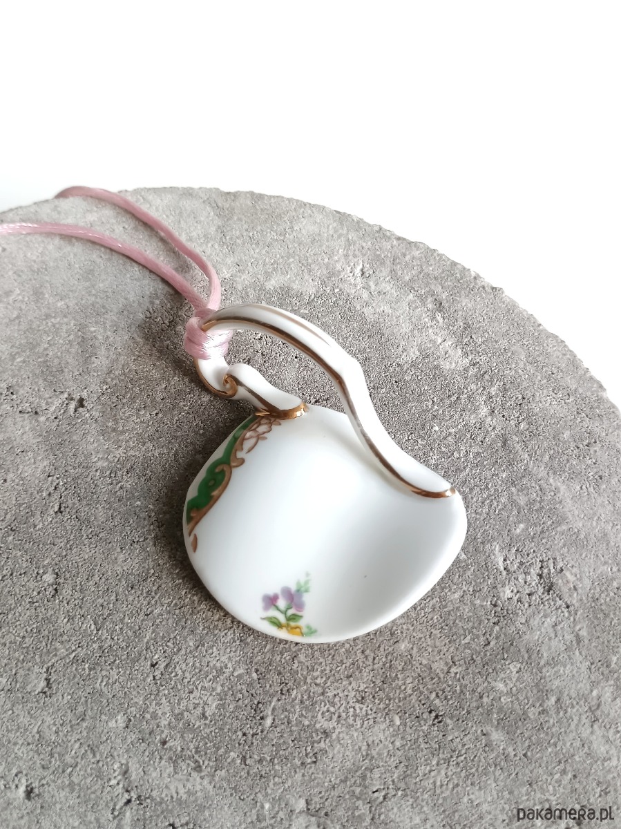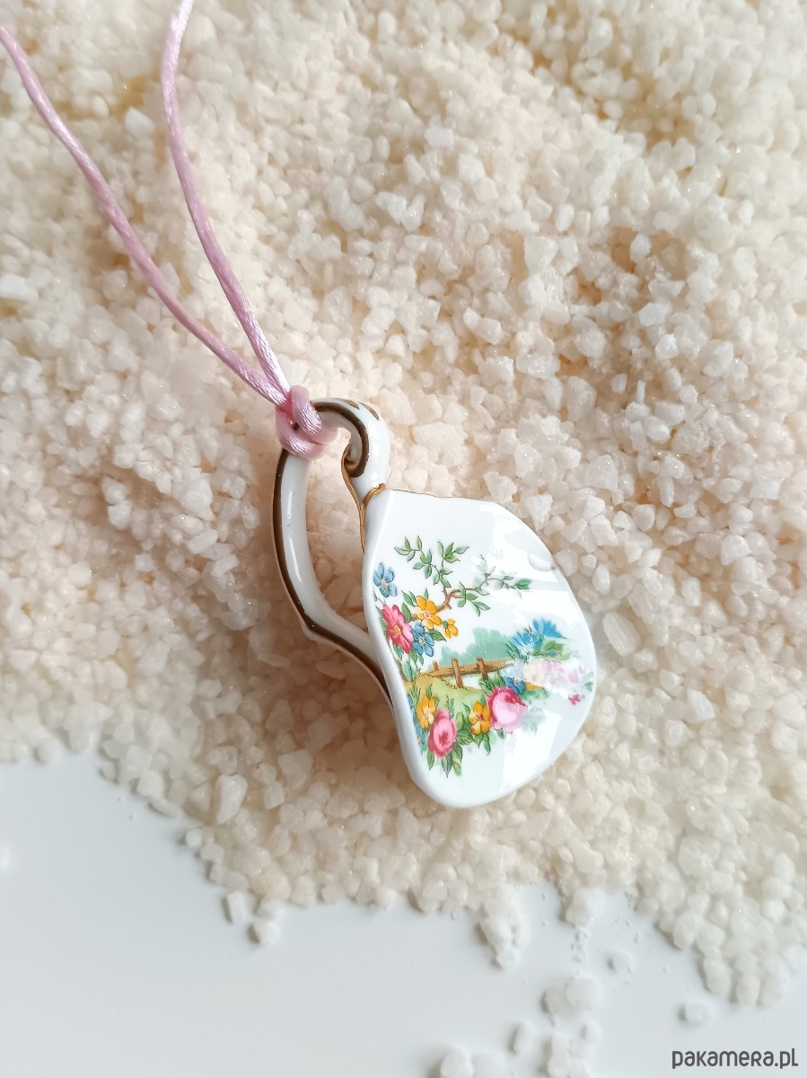 Wyjątkowy naszyjnik, który wykonałam z fragmentu stłuczonej filiżanki w kwiatowe wzory. Fragment oszlifowałam w opływowy kształt. Brzegi pokryłam lakierem, co sprawia, że nie brudzą się i nie chłoną wilgoci. Do zawieszki dobrałam satynowy sznureczek w kolorze różowym. Wymiary elementu ceramicznego: 44 x 67 mm. Długość sznureczka w całości: ok. 80 cm (naszyjnik zakłada się przez głowę). Upcykling - nie reprodukuję wykorzystywanych wzorów, niczego nie domalowuję - wykorzystuję wyłącznie oryginalne naczynia i motywy, które się na nich znajdują. Tym samym, stłuczce z odzysku nadaję nowe życie.
