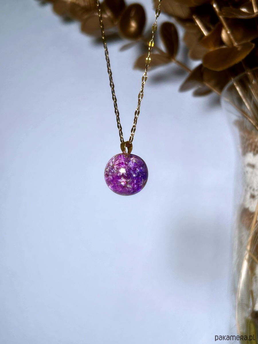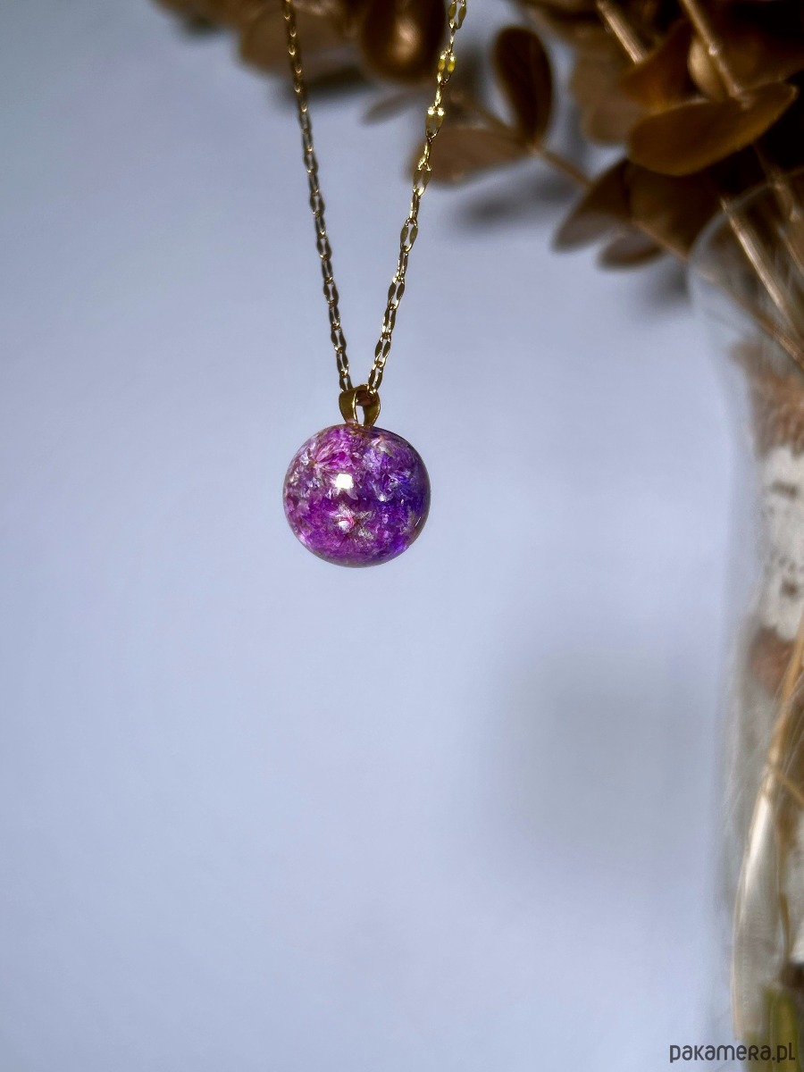Naszyjnik z fioletowymi gipsówkami zamkniętymi w kulce z żywicy