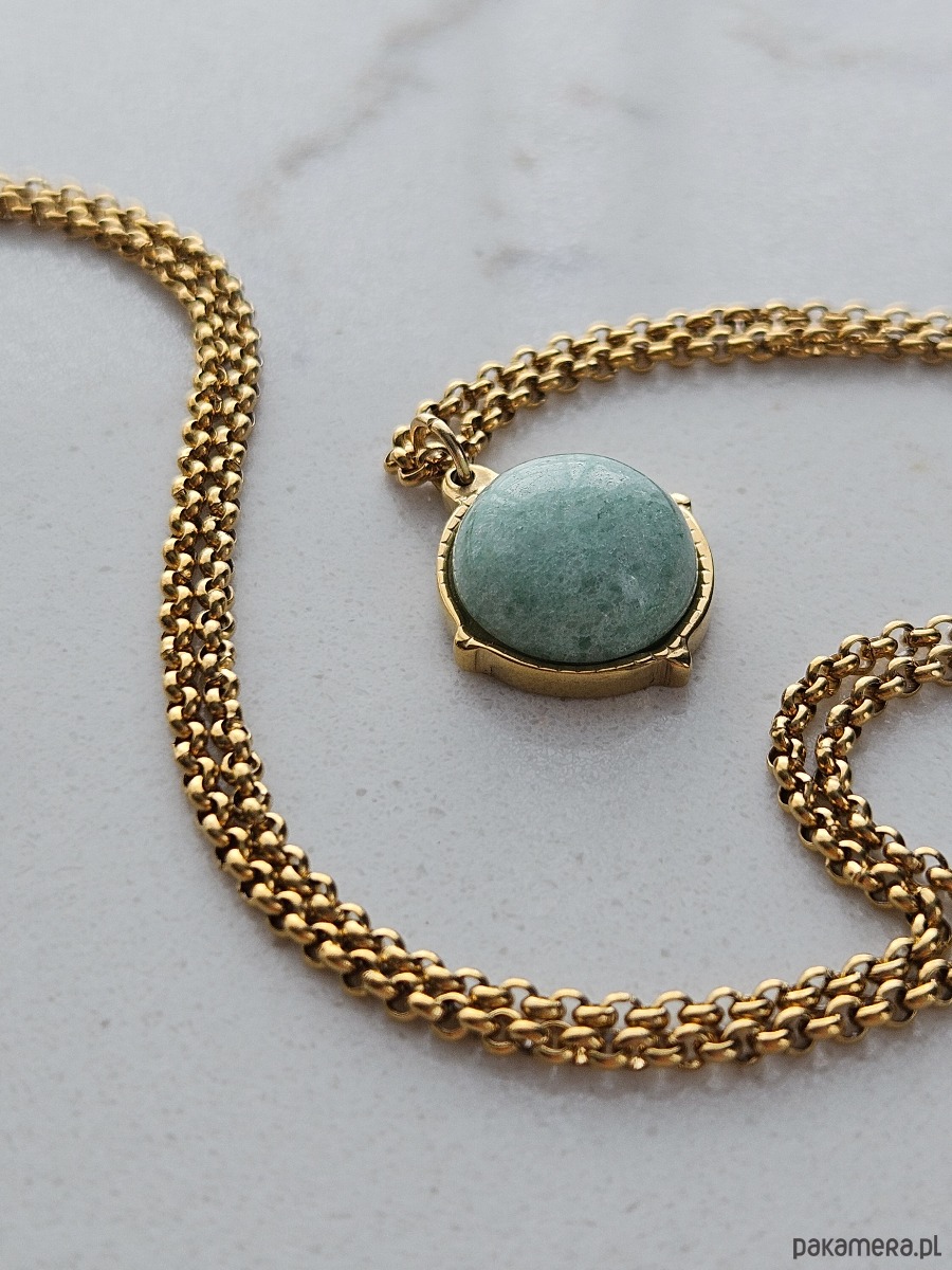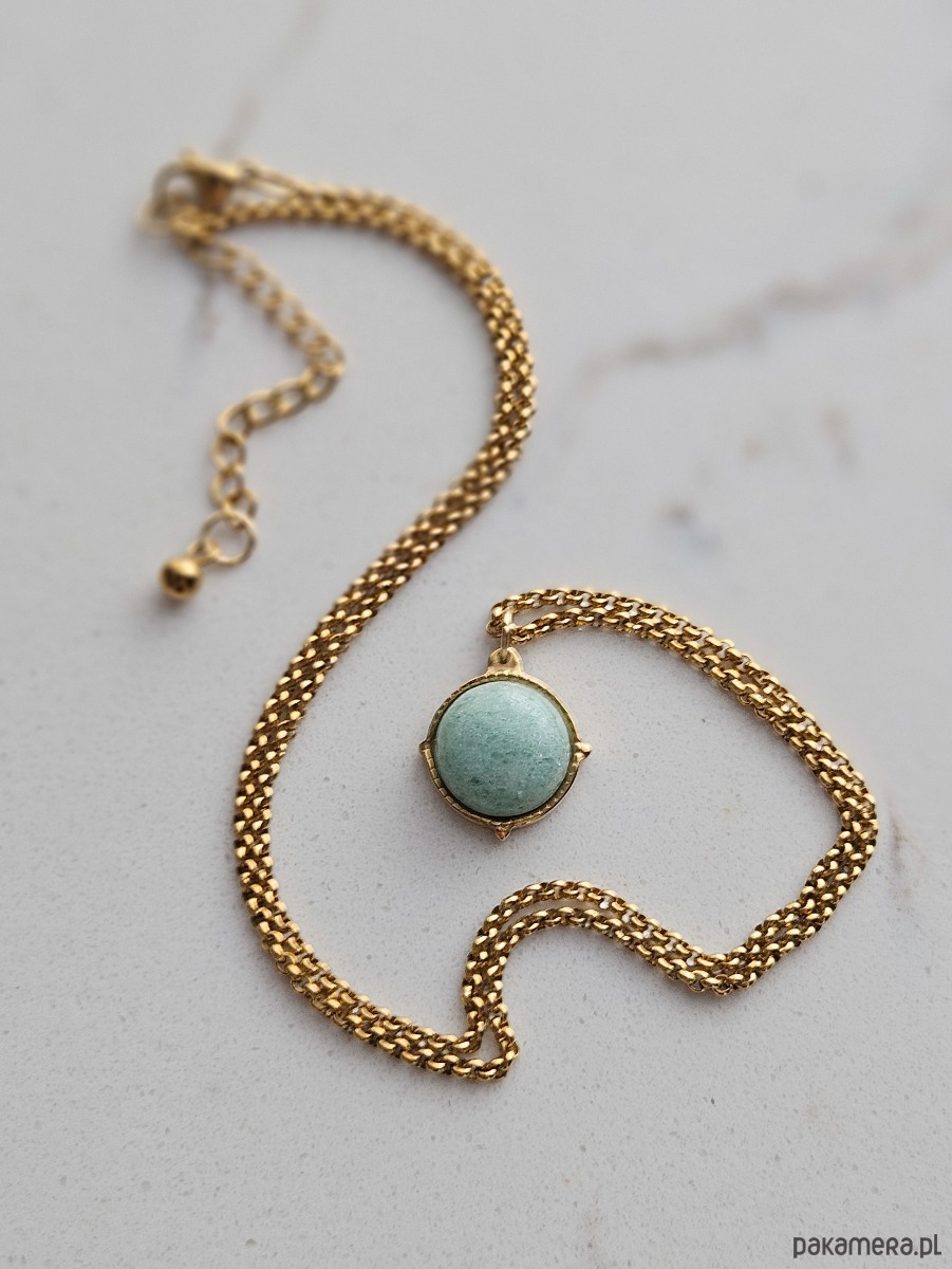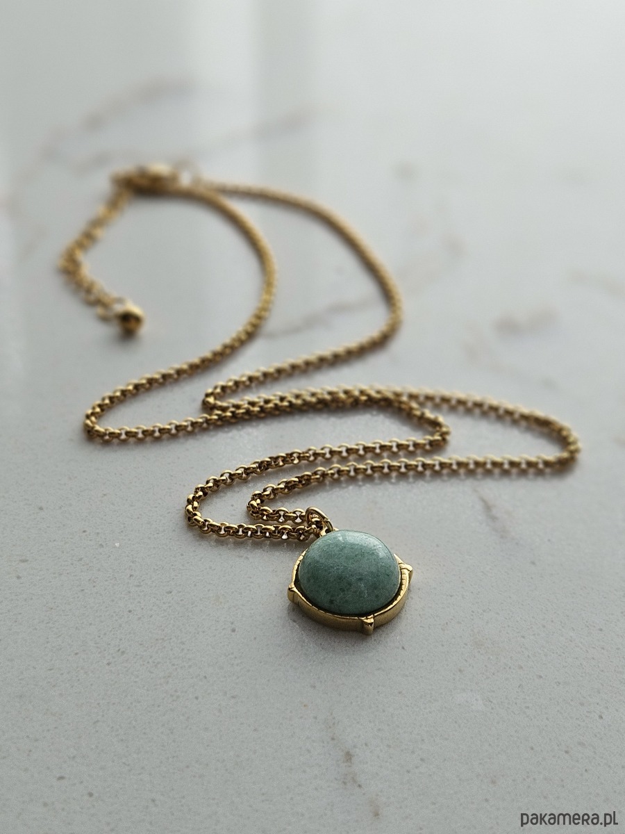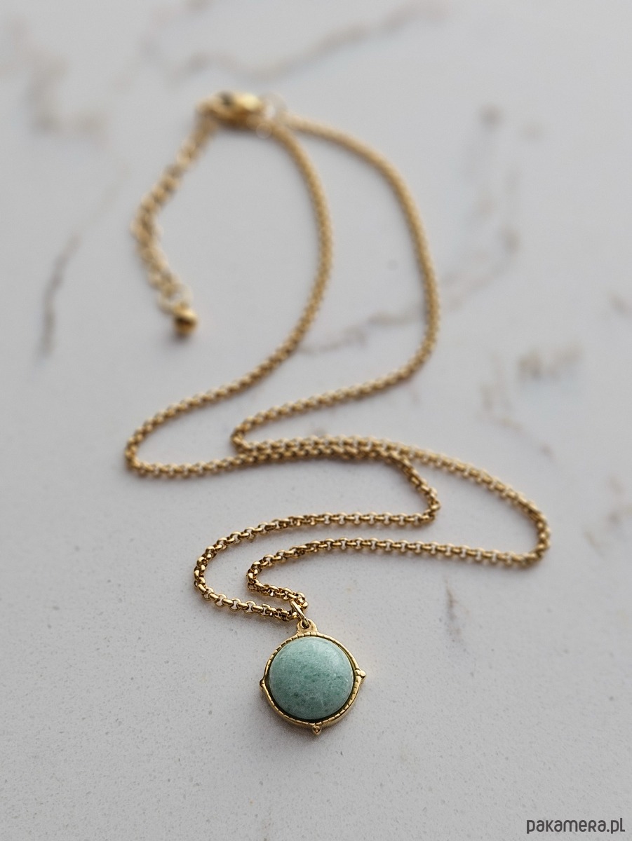 Delikatny naszyjnik w stylu vintage - łączy w sobie wyrazisty łańcuszek i okrągły, zielono - miętowy fluoryt w uroczej oprawie. Wzbogacony łańcuszkiem regulacyjnym, który nie tylko daje swobodę w ustawieniach długości naszyjnika, ale też pełni funkcję dekoracyjną. Zakończenie łańcuszka regulacyjnego przyozdobione zostało złotą kuleczką ze stali szlachetnej.