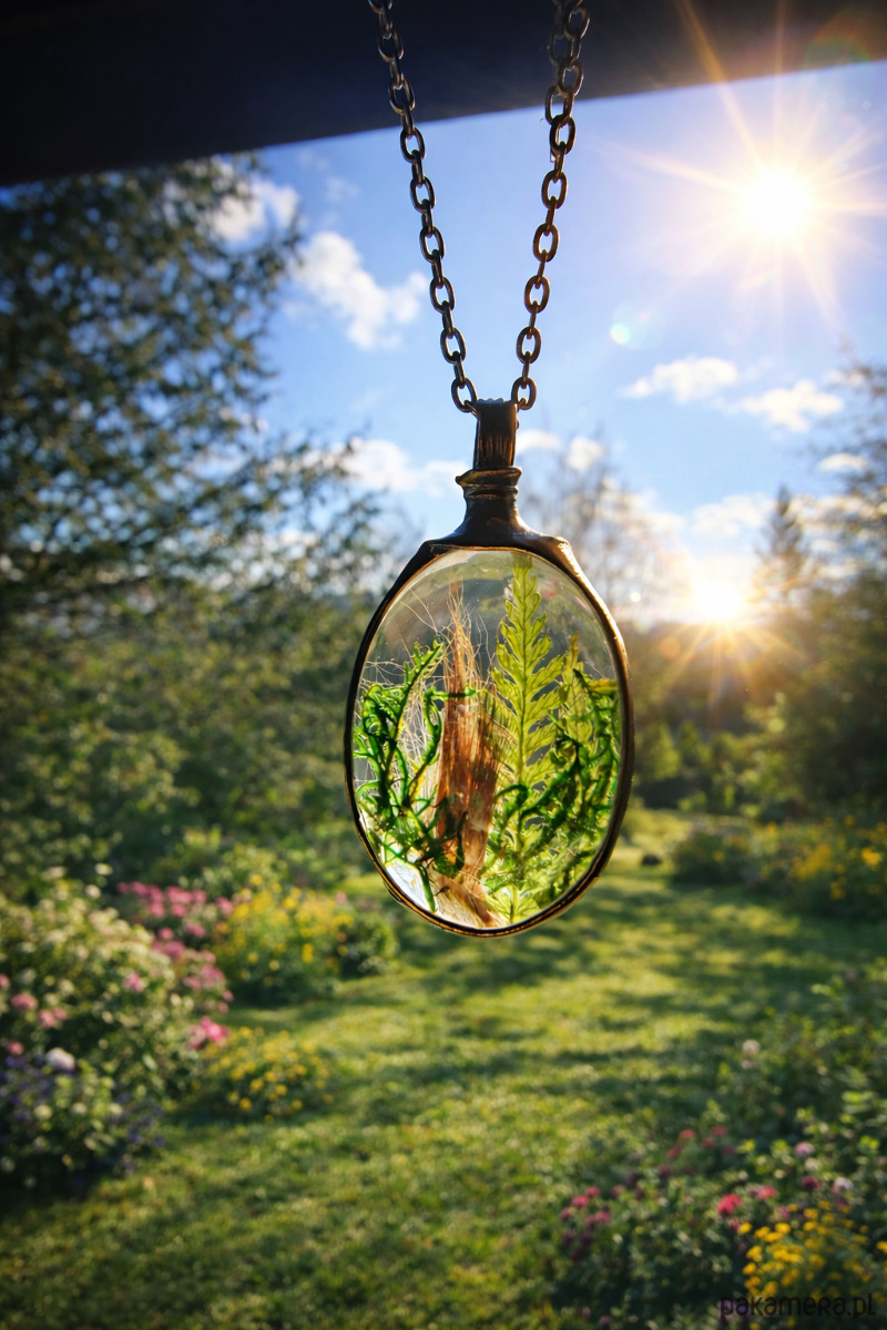 Wisiorek wykonujemy z dwóch w pełni przezroczystych tafli szkła, które pozwalają subtelnie wyeksponować zawartość. Całość jest ręcznie lutowana metodą Tiffany przy użyciu bezołowiowej cyny i wykończona w odcieniu starego srebra. Każdy egzemplarz powstaje indywidualnie w naszej pracowni MARIAELA w Polsce.
