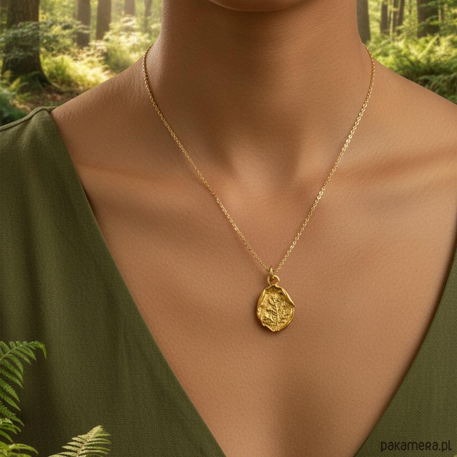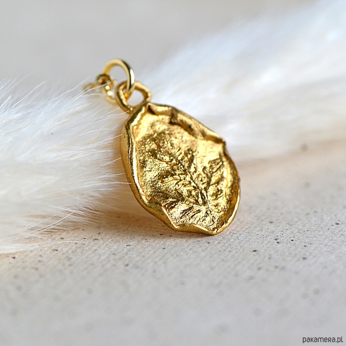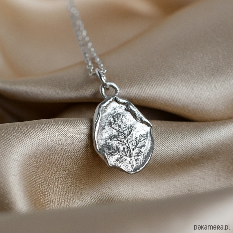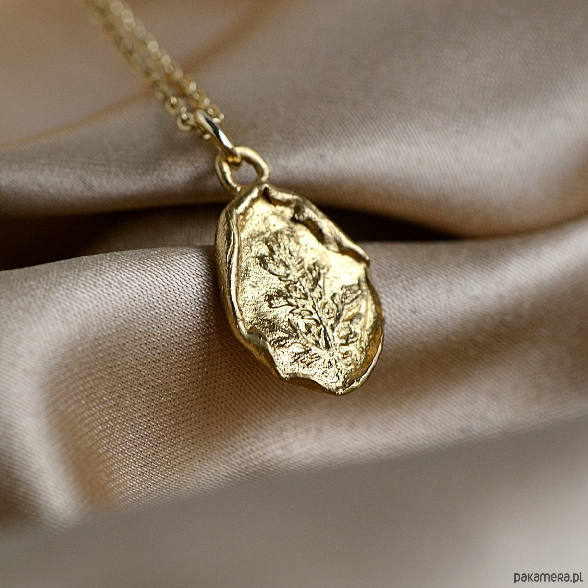 Naszyjnik z odbitą w zawieszce gałązką roślinki. Boki zawieszki uformowane ręcznie przypominają urwaną kartkę papieru. Bardzo oryginalny naszyjnik z motywem roślinnym, wykonany w całości ręcznie. Zawieszka jest delikatna i lekka, idealna jako biżuteria również codzienna.