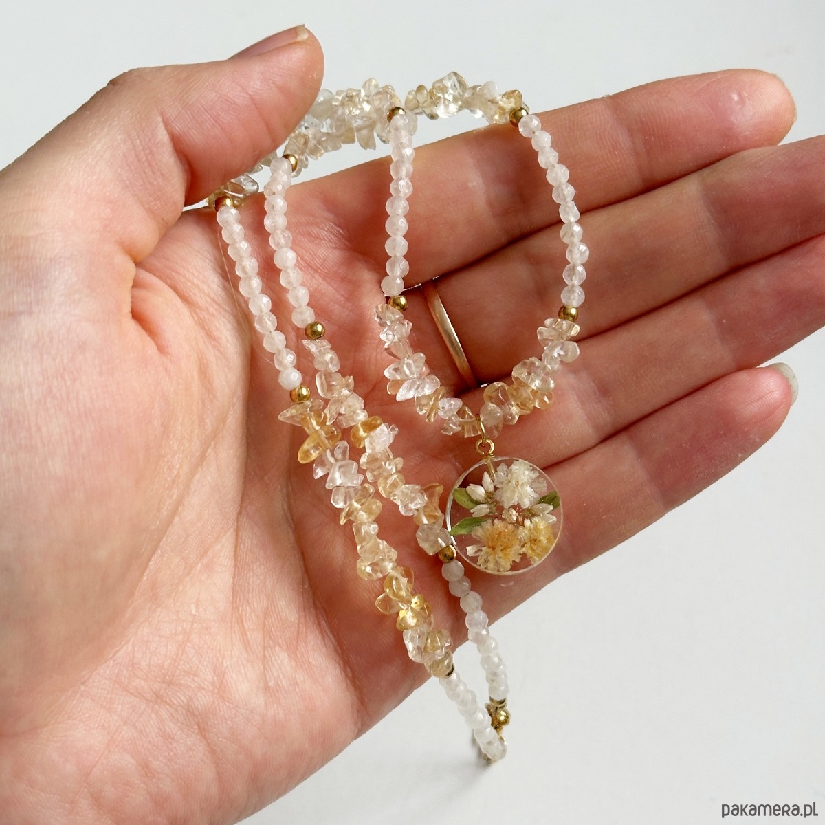 Materiały – suszone kwiaty, stal szlachetna kamienie naturalne, żywica epoksydowa