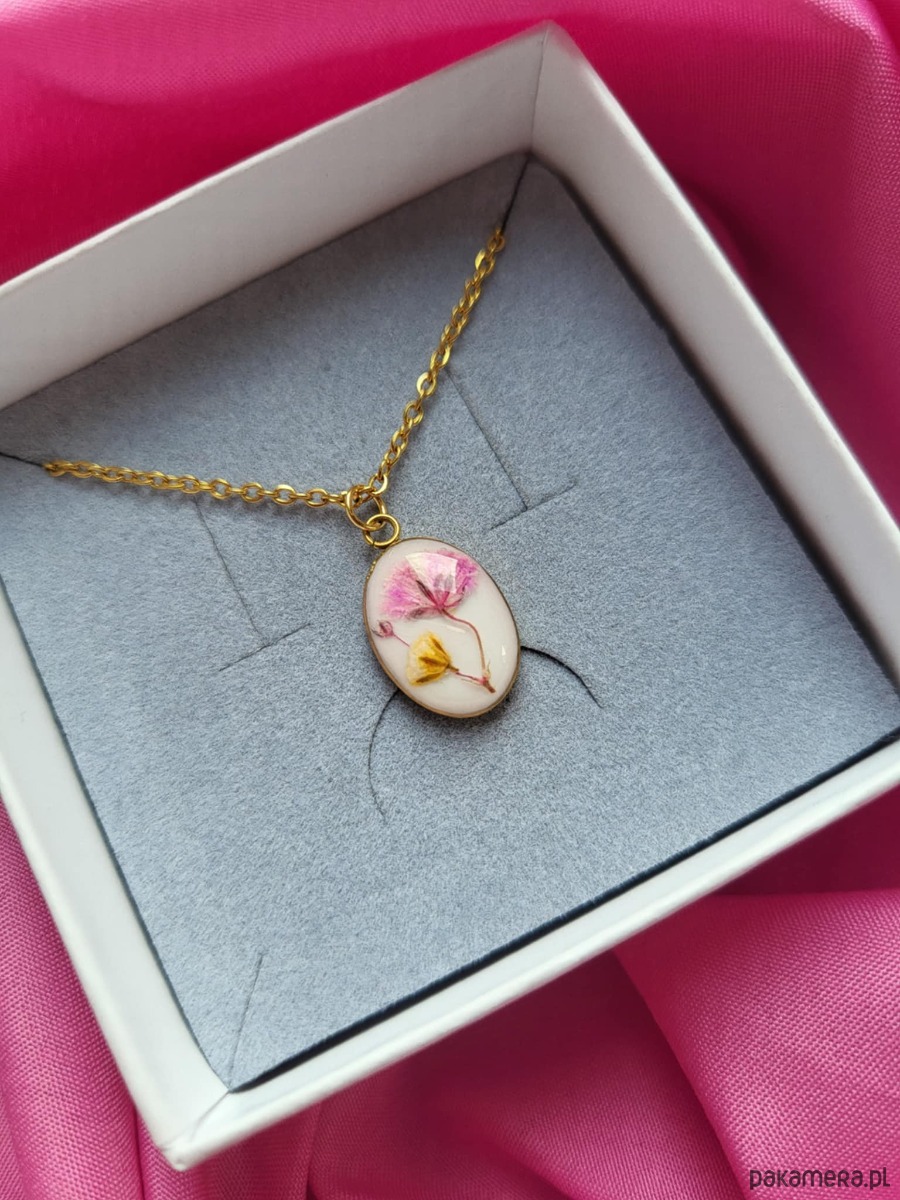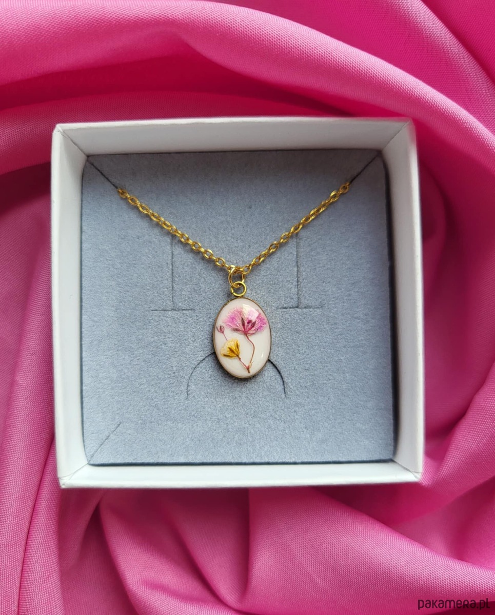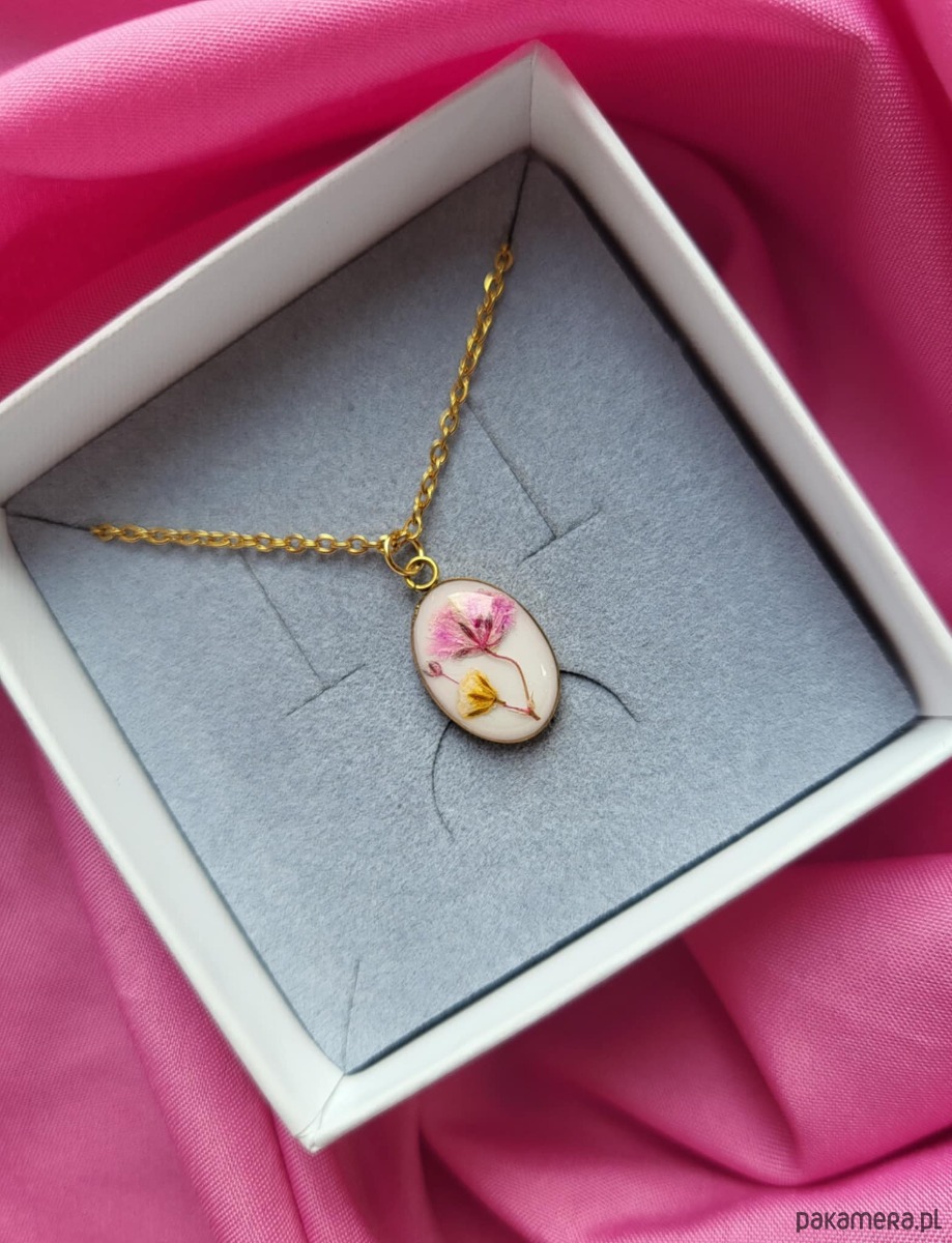 Naszyjnik z kwiatami suszonej gipsówki to unikatowa, ręcznie wykonana biżuteria z serii Harmonia.