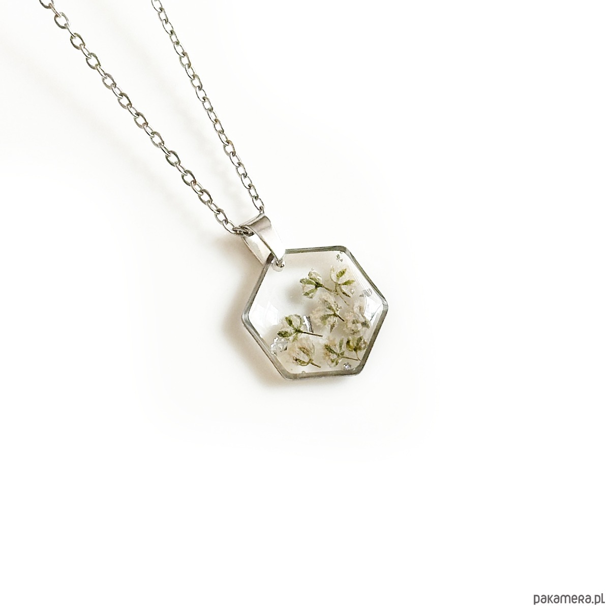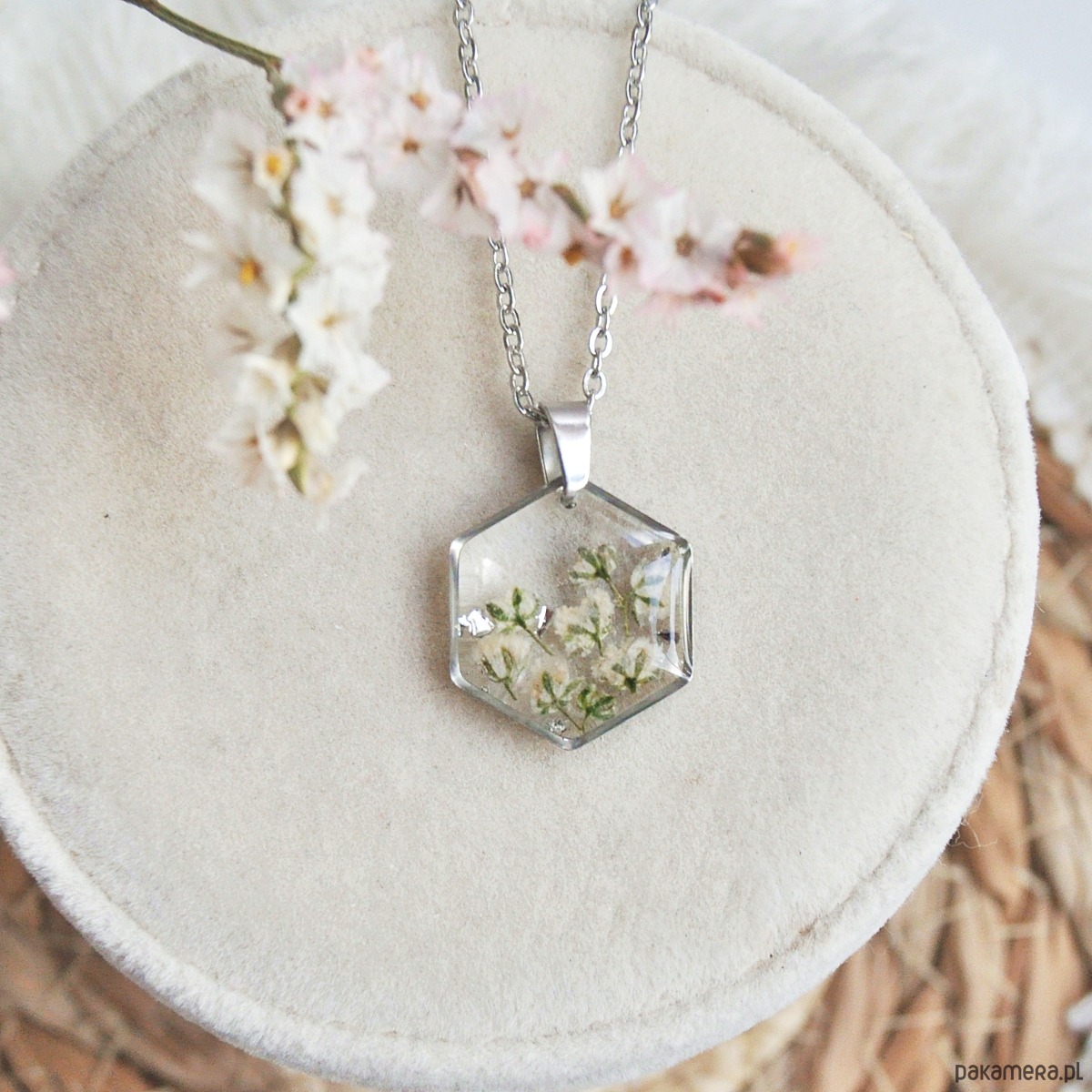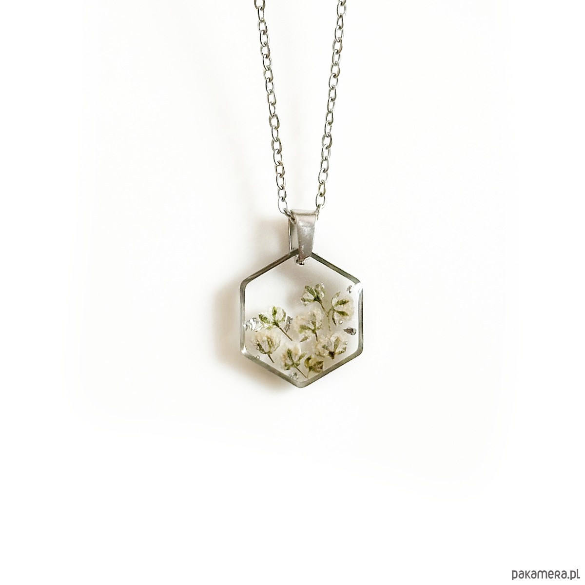 Naszyjnik o wymiarach 1,6cm. Zostały w nim zatopione kwiaty gipsówki.