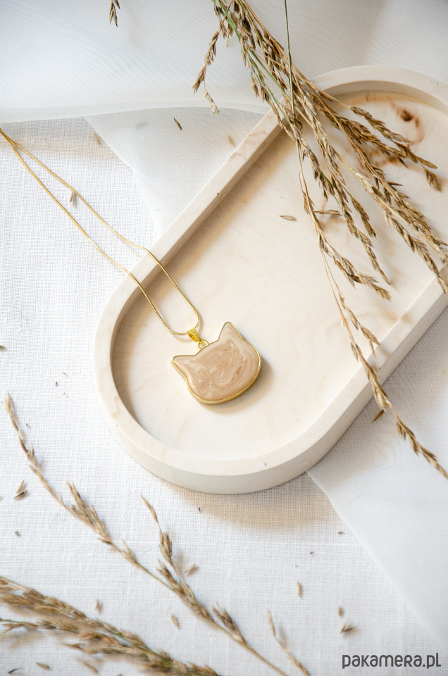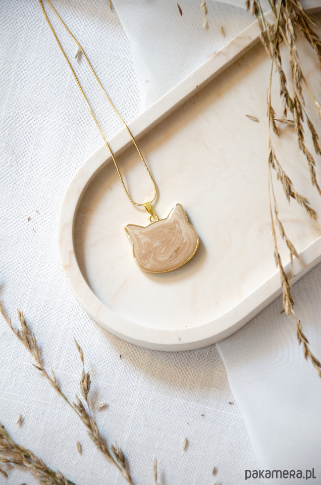 Wzbogać swoją stylizację o wykonany handmade naszyjnik z gipsu polimerowego w kształcie głowy kotka! Posiada elegancki, beżowy kolor i jest wzbogacony techniką marmurka tworzącą ciekawy efekt. Ten uroczy dodatek świetnie sprawdzi się na co dzień, jak i na specjalne okazje.
