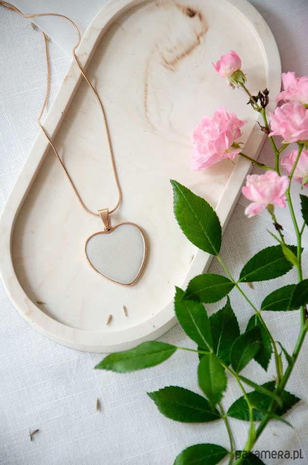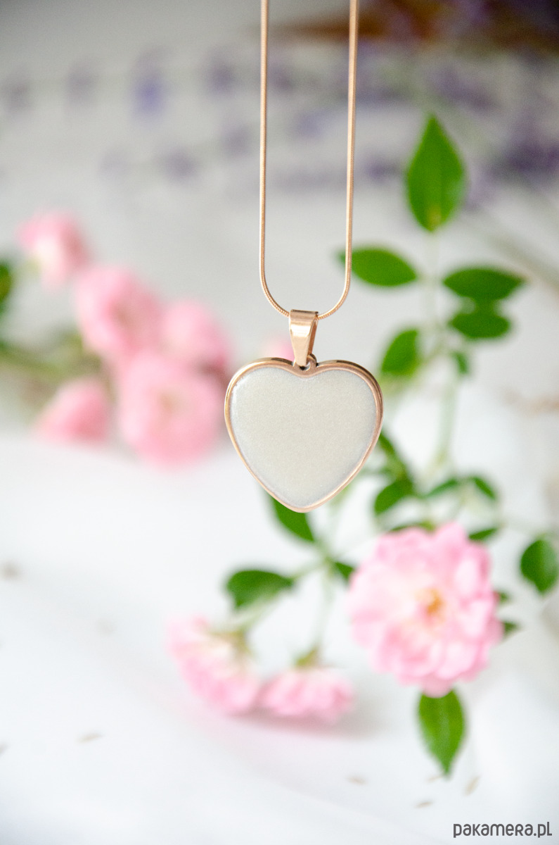 Wzbogać swoją stylizację o wykonany handmade naszyjnik z gipsu polimerowego w kształcie serca! Posiada elegancki, biały kolor i jest wzbogacony brokatem, co tworzy ciekawy efekt. Ten uroczy dodatek świetnie sprawdzi się na co dzień, jak i na specjalne okazje.