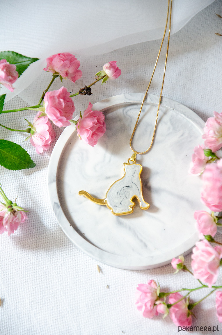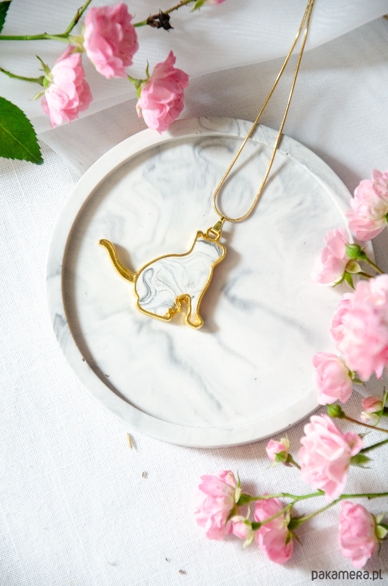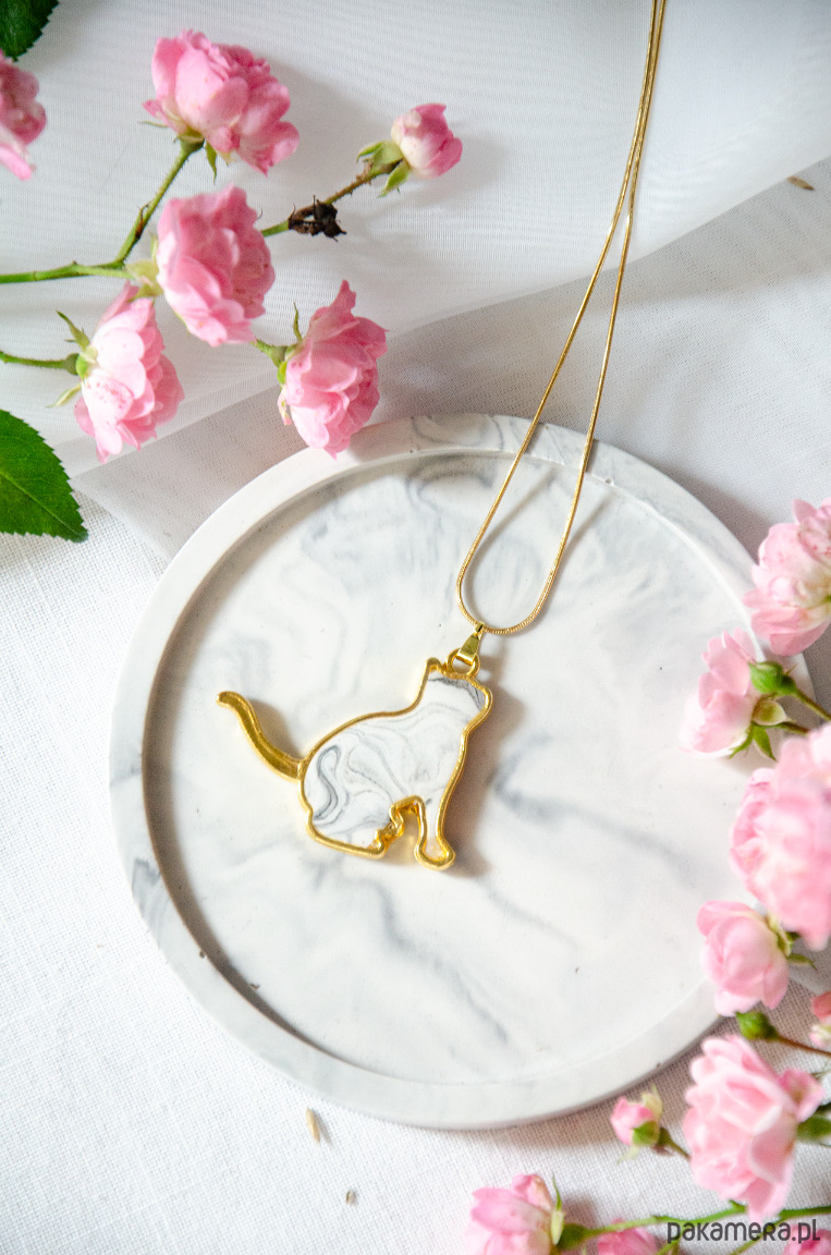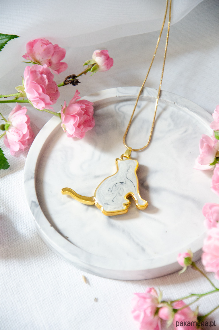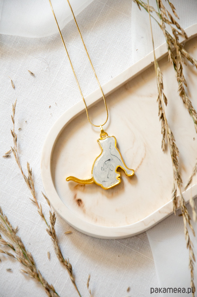 Wzbogać swoją stylizację o wykonany handmade naszyjnik z gipsu polimerowego w kształcie siedzącego kotka! Posiada elegancki, biały kolor i jest wzbogacony techniką szarego marmurka tworzącą ciekawy efekt. Ten uroczy dodatek świetnie sprawdzi się na co dzień, jak i na specjalne okazje.