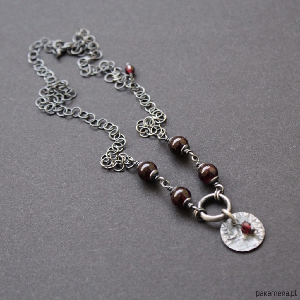 Oryginalny naszyjnik wykonany został z oksydowanego srebra próby 925 oraz kuleczek granatów wielkości 0,6 cm.