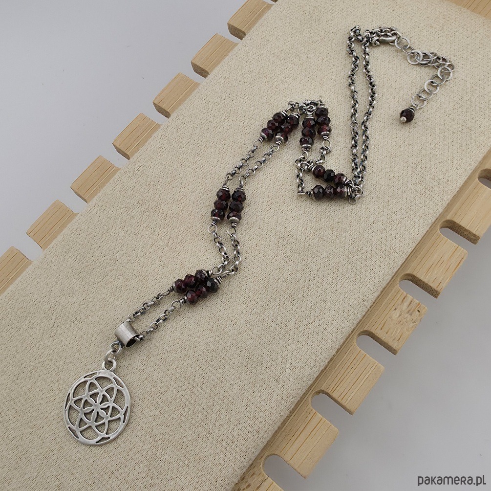 Modny i kobiecy naszyjnik na co dzień i nie tylko. Wykonany w całości z oksydowanego srebra próby 925 oraz fasetowanych oponek grabatu wielkosci 4x2mm. Wielkosc wisiorka to ok. 2 cm. Obwód naszyjnika to 45,5 cm plus regulacja 5 cm. Ozdobnie zapakowany.