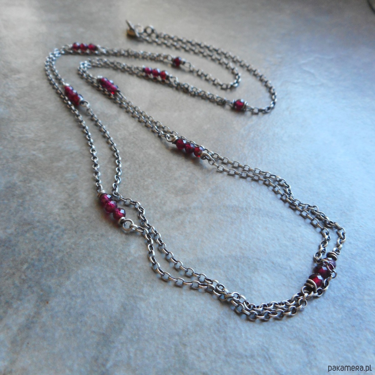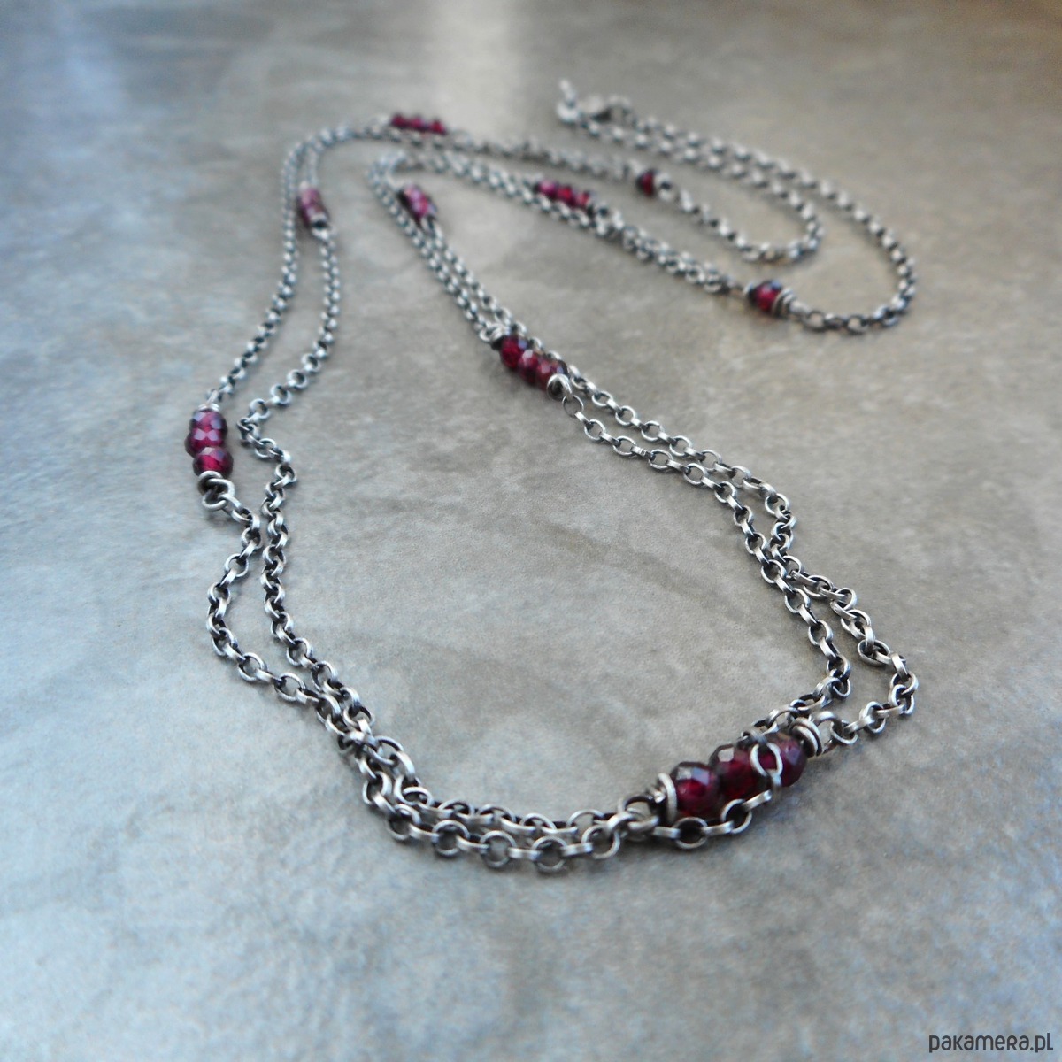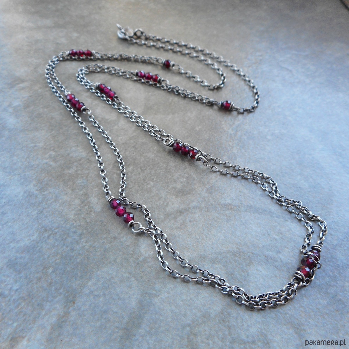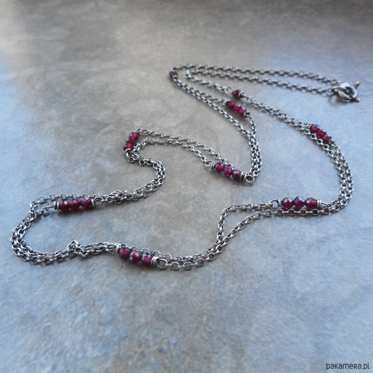 Delikatny, piękny naszyjnik wykonany ze szlachetnego srebra i kamieni naturalnych; połączenie połyskujących eleganckich granatów i oksydowanego srebra nadaje biżuterii głębi i kontrastu, uniwersalny charakter naszyjnika sprawia, że będzie pasował do wielu stylizacji.