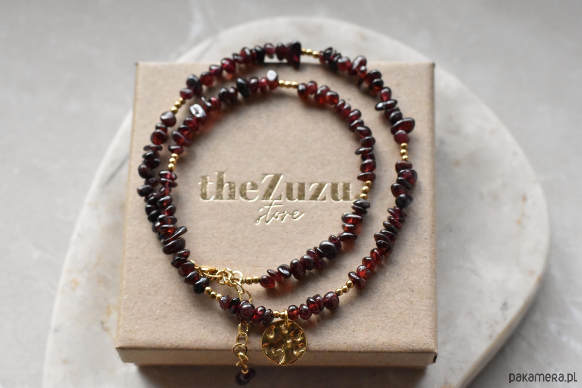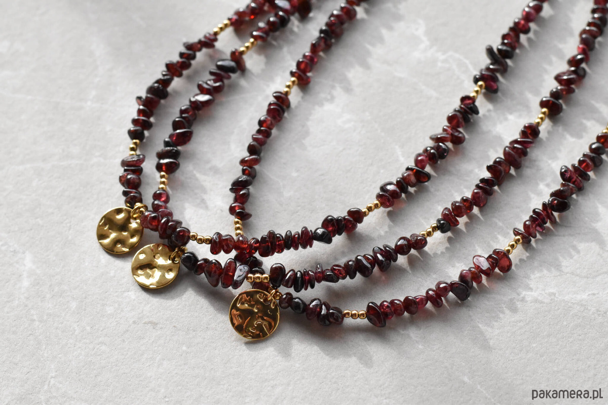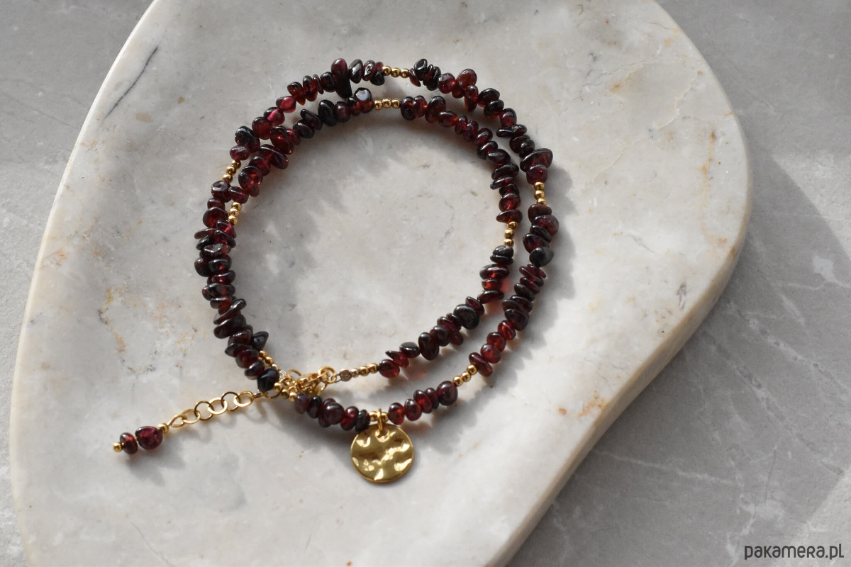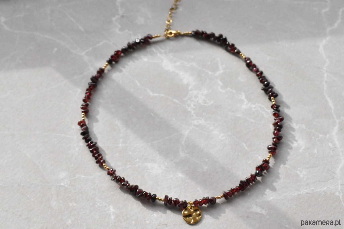 Naszyjnik z granatem i hematytem to elegancka biżuteria o głębokiej, burgundowej barwie. Nieregularne drobne bryłki granatu pięknie odbijają światło, a akcenty z hematytu dodają całości lekkości. Naszyjnik został wykończony klasycznym, wygodnym zapięciem oraz gniecioną zawieszką, która nadaje mu charakteru.