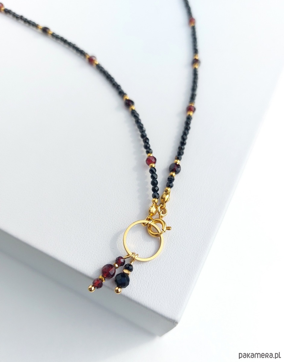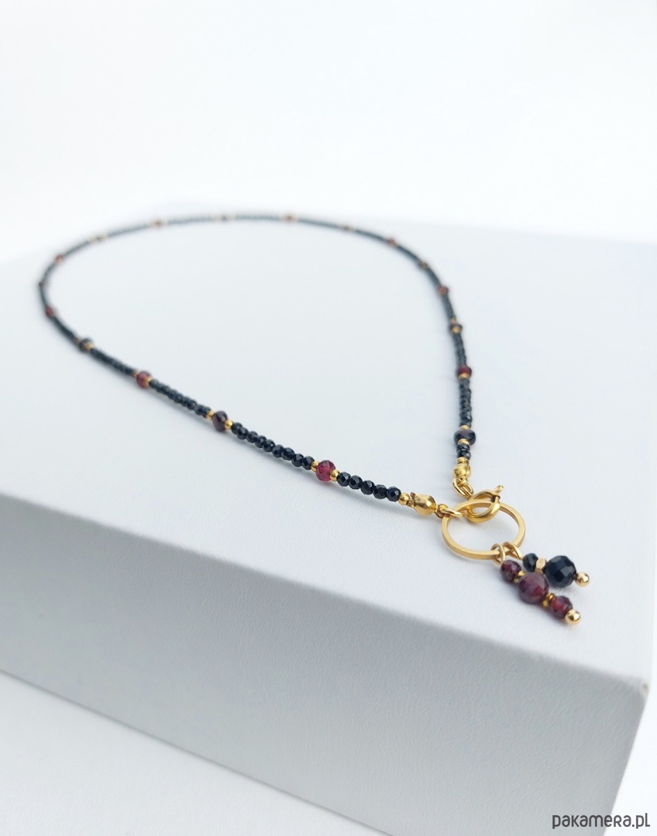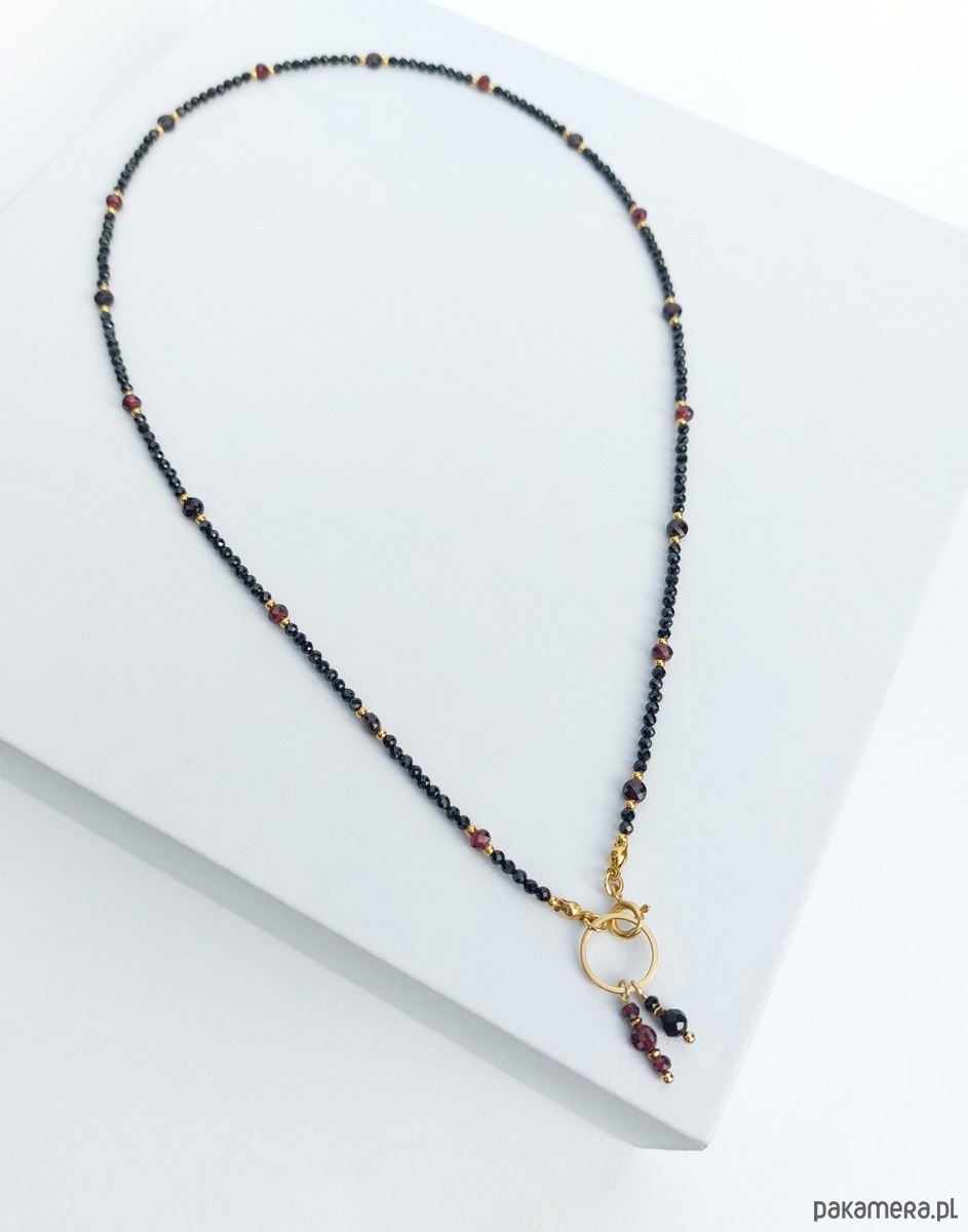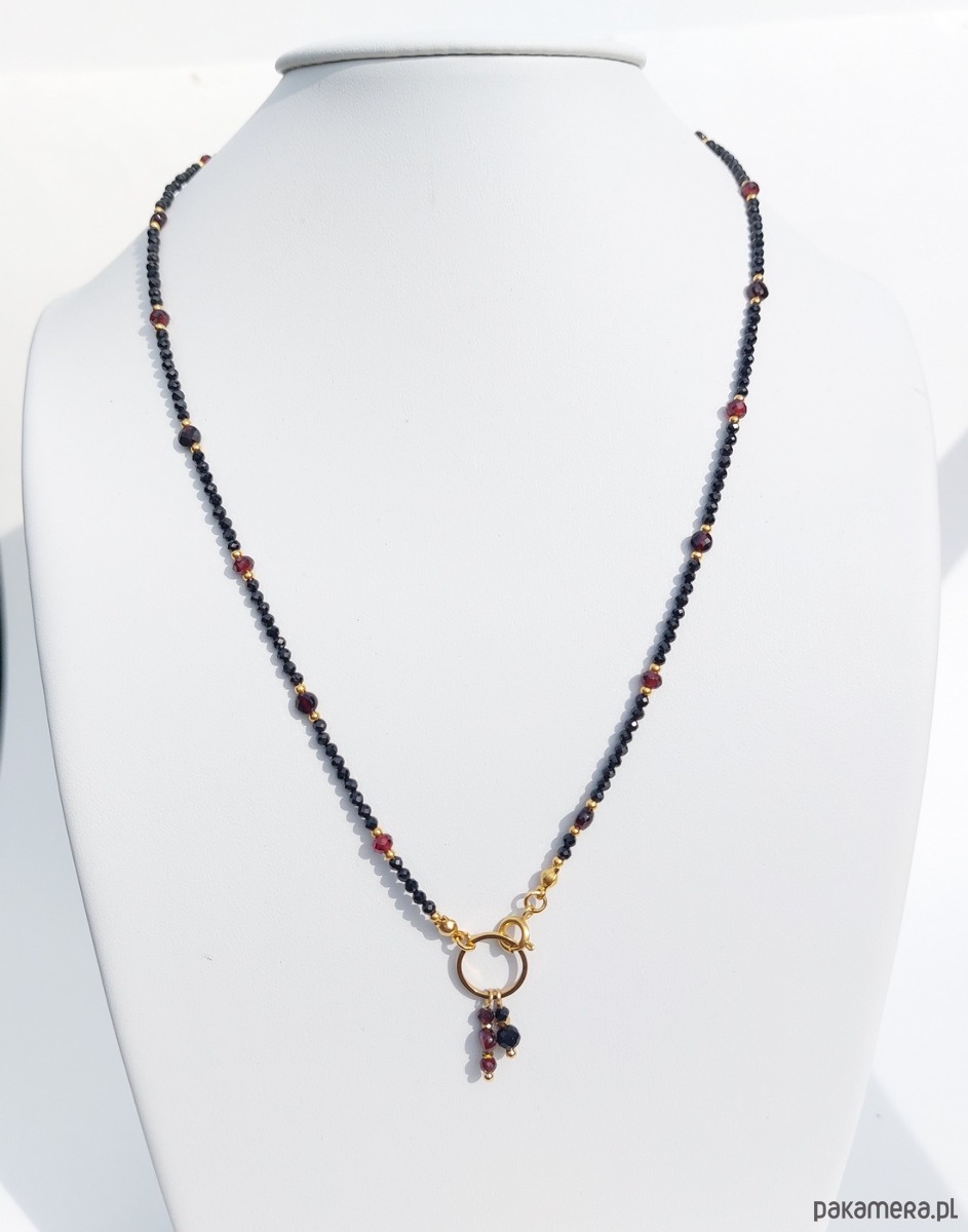 Naszyjnik z drobnych kamieni naturalnych: spinelu i granatu. Drobny czarny spinel niesamowicie połyskuje w słońcu, a granat o głębokim kolorze czerwonego wina dodaje naszyjnikowi wyjątkowego charakteru. Naszyjnik jest nieco dłuższy, ma wygodne zapięcie z przodu i ozdobną zawieszkę.