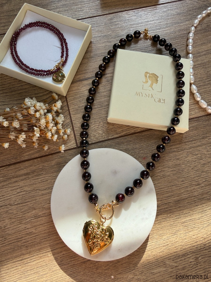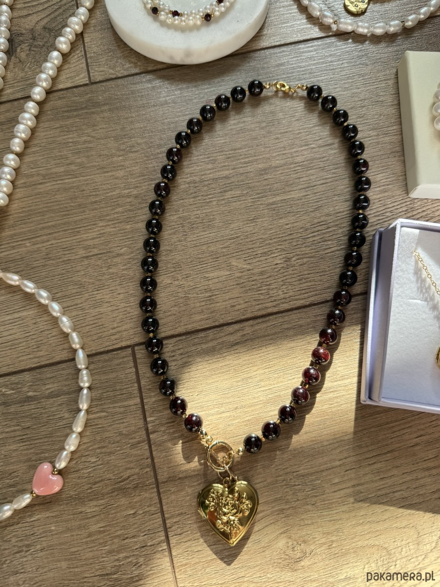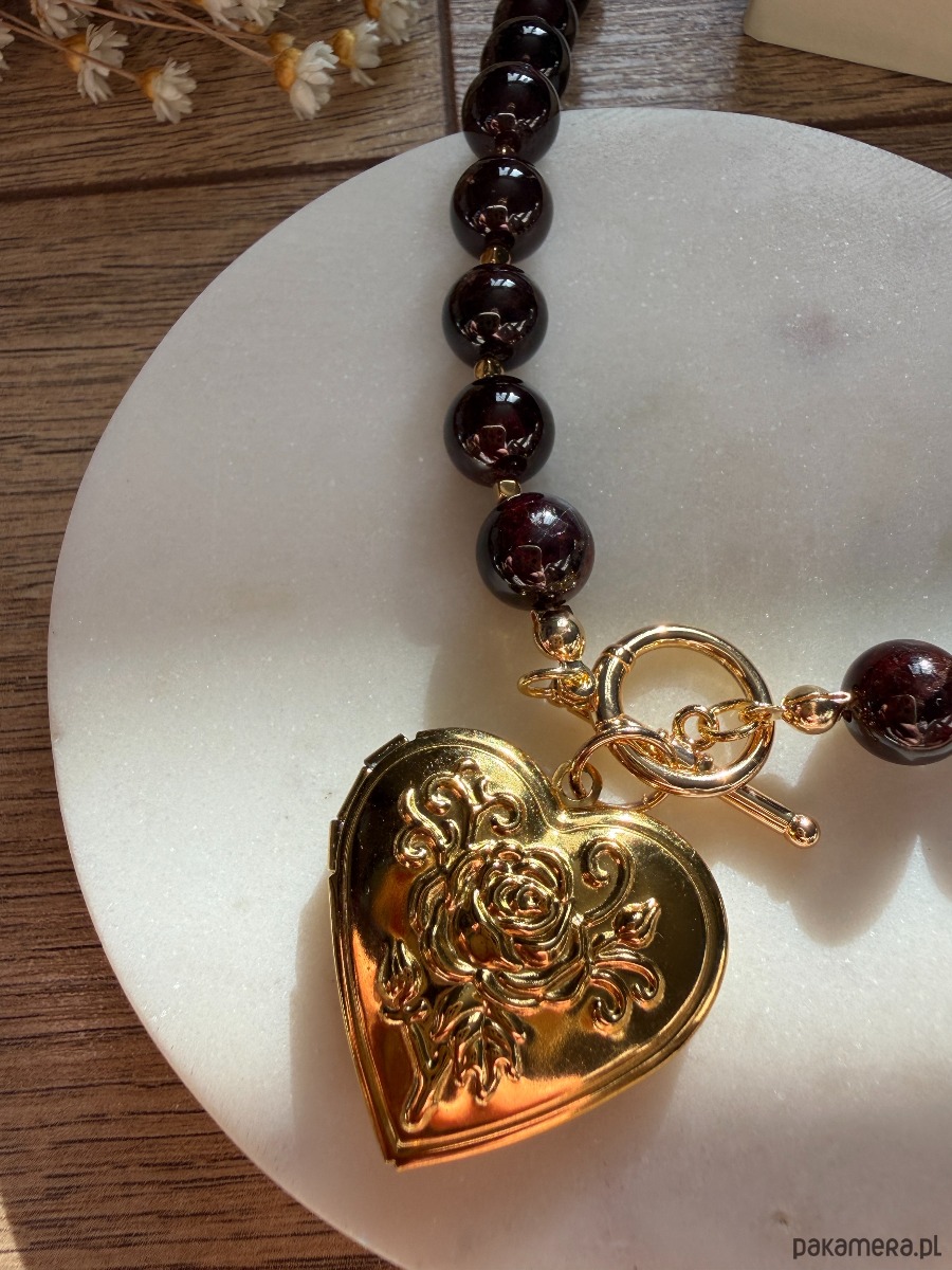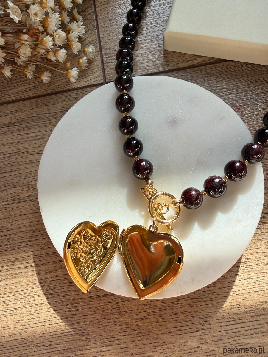 Naszyjnik z granatów ze złotym sercem sekretnik