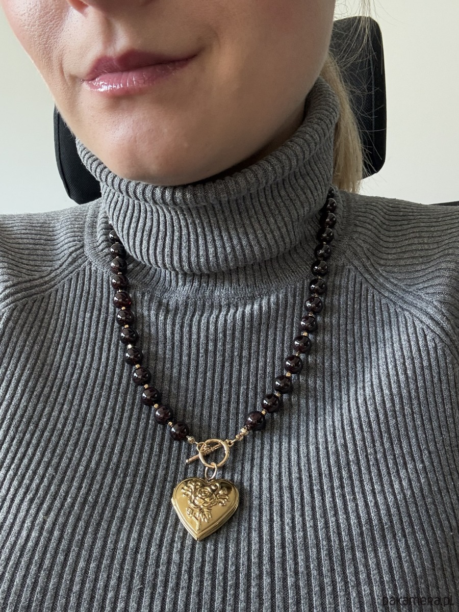 Ręcznie robiony naszyjnik z granatów ze złotym sercem ze stali w formie sekretnika.