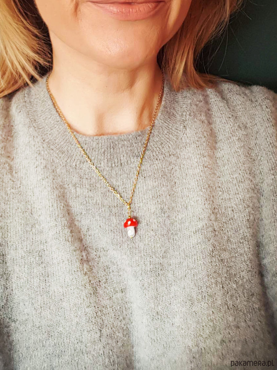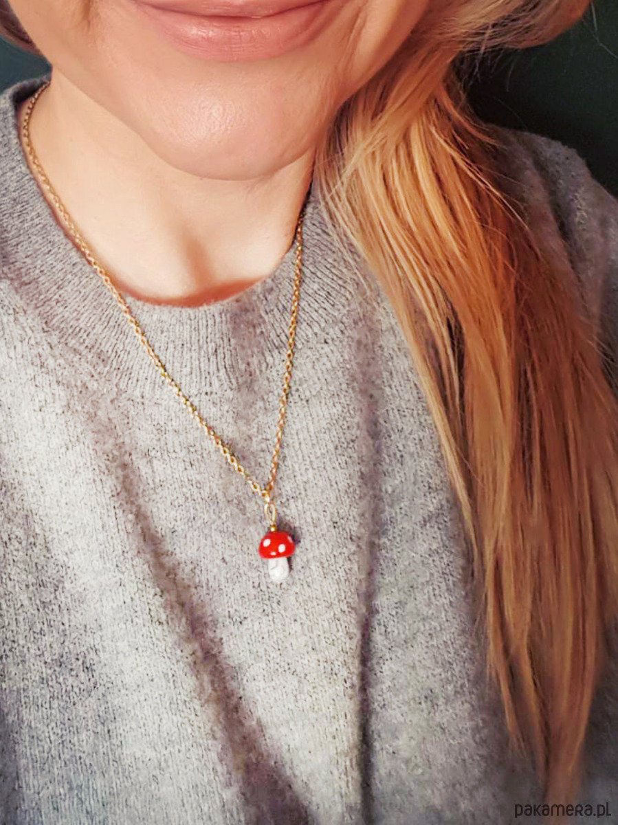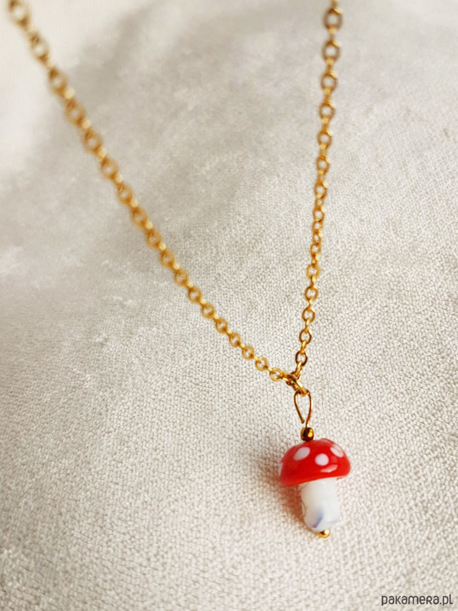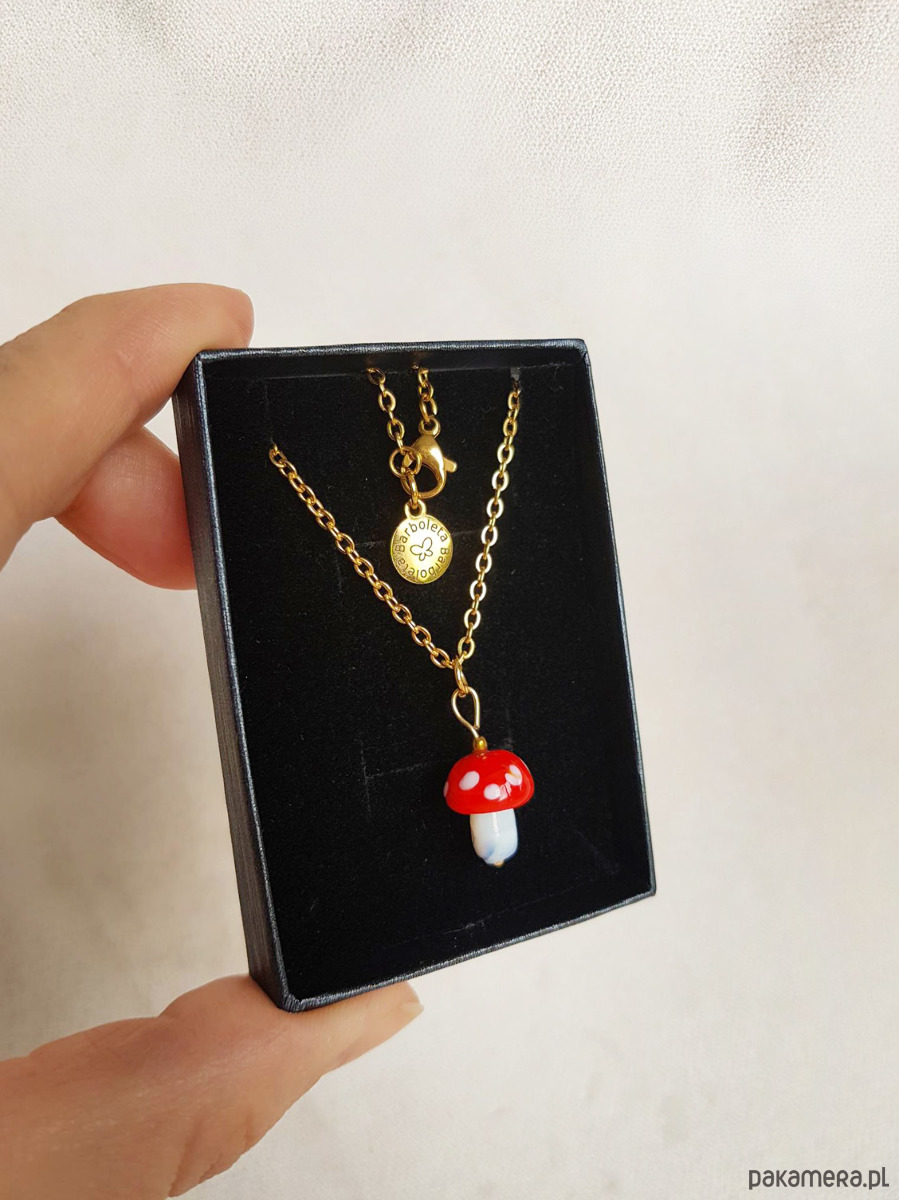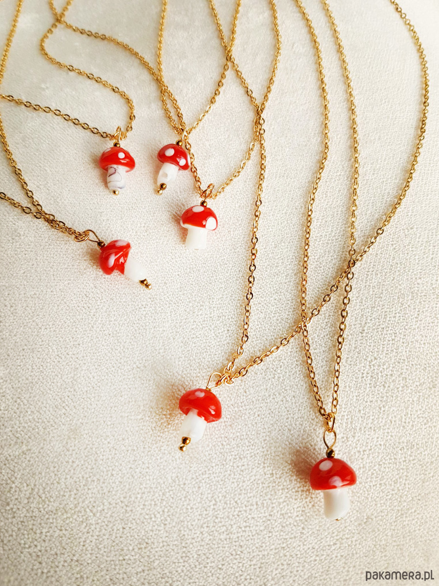 Uroczy naszyjnik Barboleta z grzybkiem muchomorkiem z ręcznie formowanego szkła.