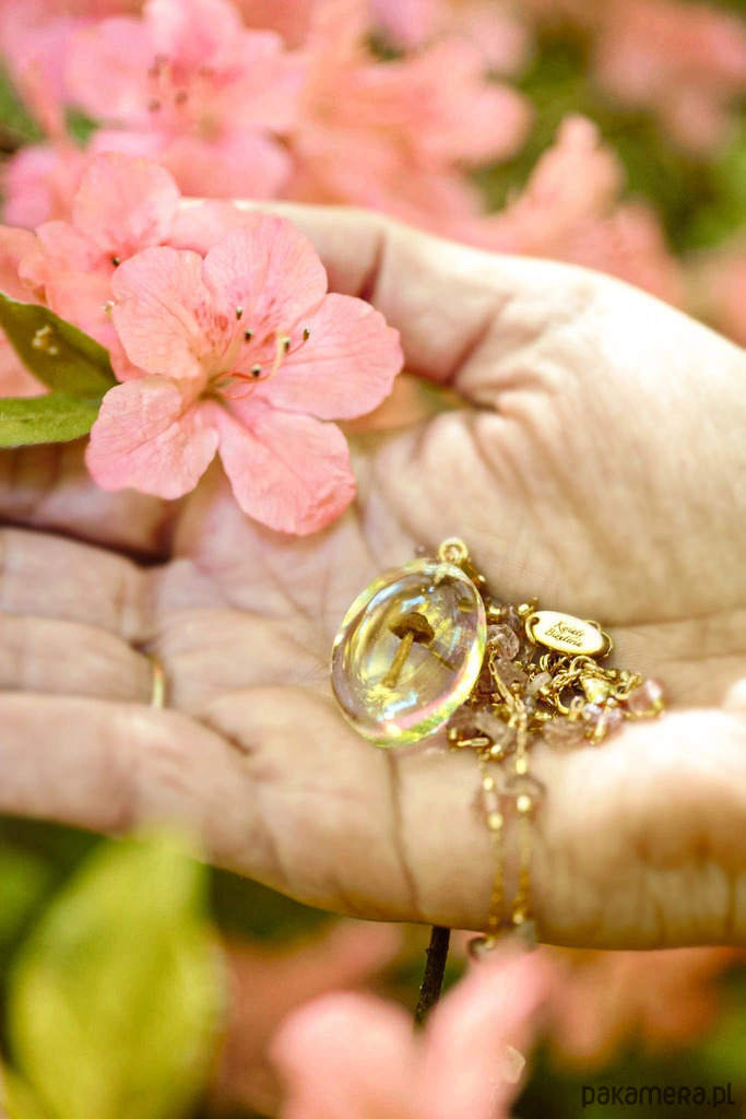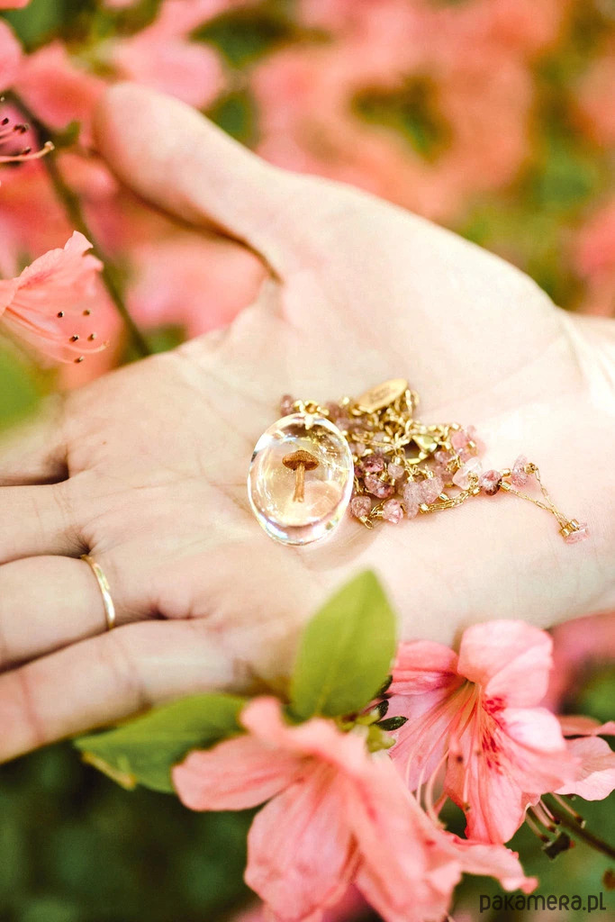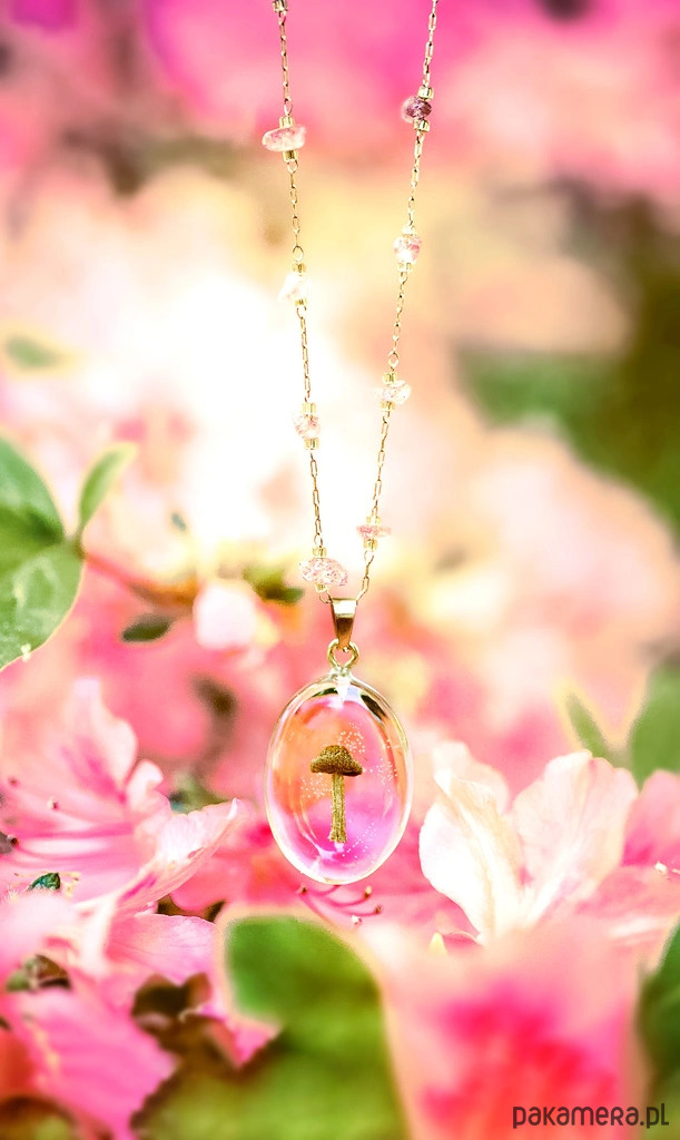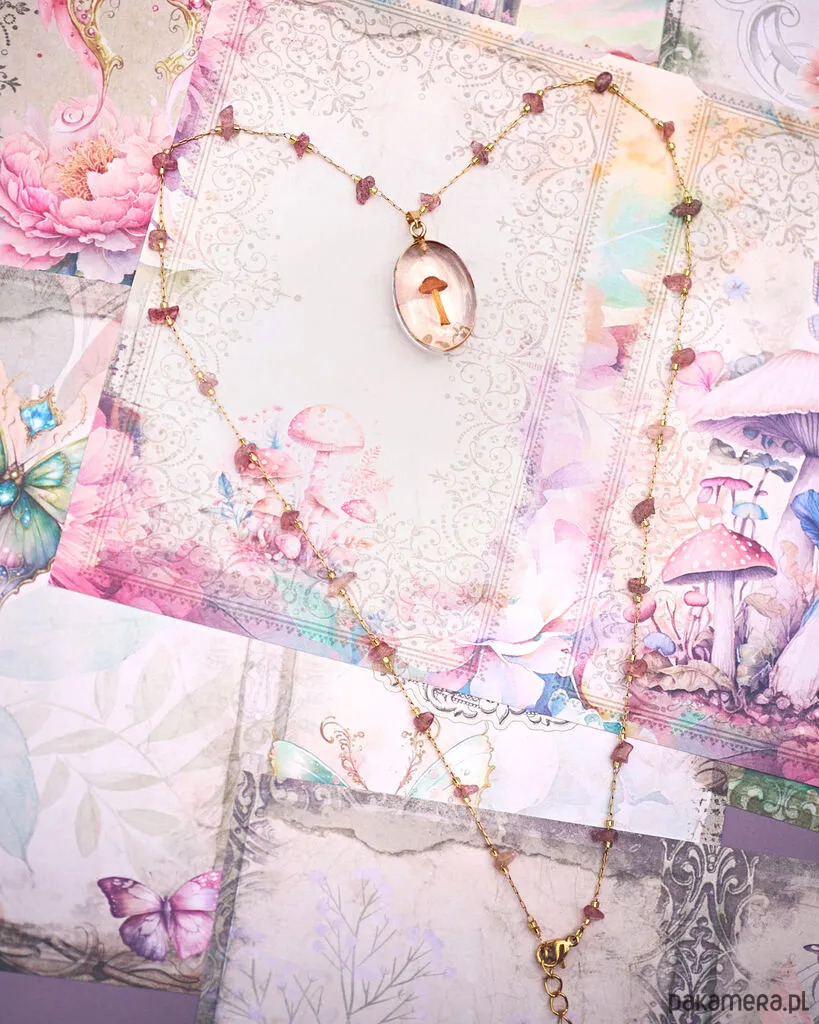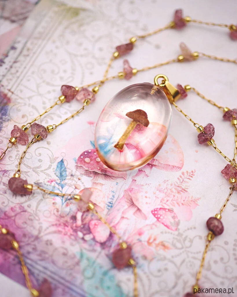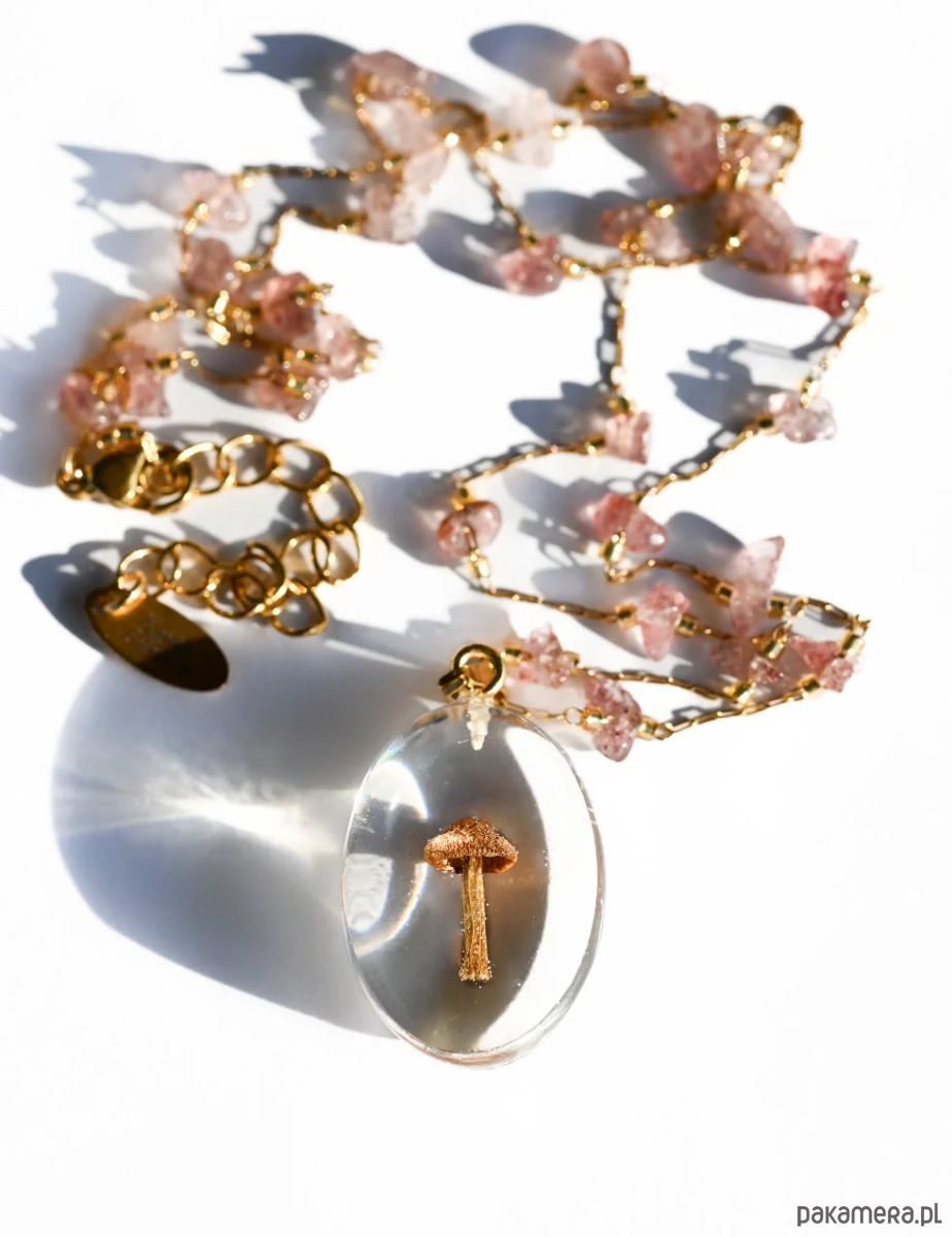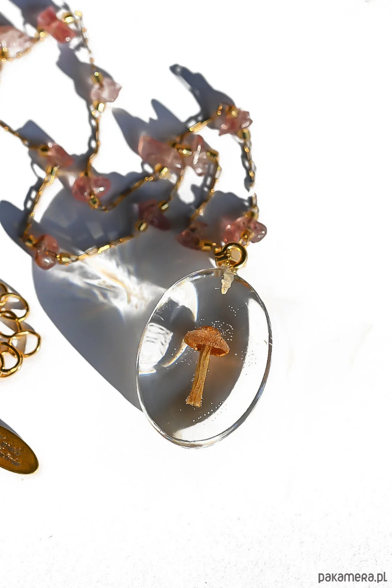 Przenieś magię lasu do swojej kolekcji biżuterii z naszym wyjątkowym naszyjnikiem z żywicy. W sercu naszyjnika znajduje się prawdziwy grzyb, starannie zasuszony i zatopiony w krystalicznej żywicy, tworząc jedyny w swoim rodzaju, artystyczny dodatek. Zawieszka osadzona jest na złotym łańcuszku ze stali nierdzewnej, ozdobionym kryształkami kwarcu truskawkowego, który dodaje całości subtelnego, różowo-złotego blasku.