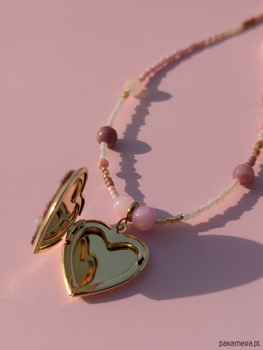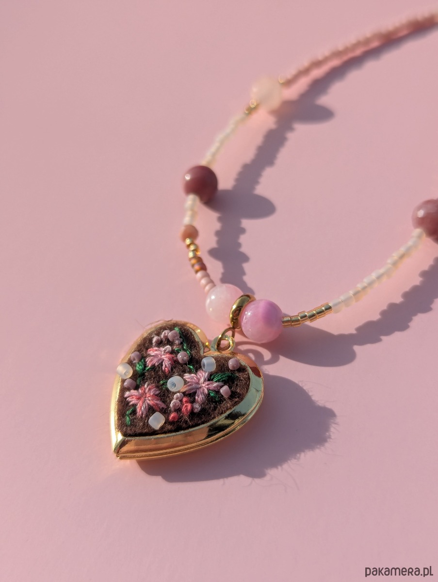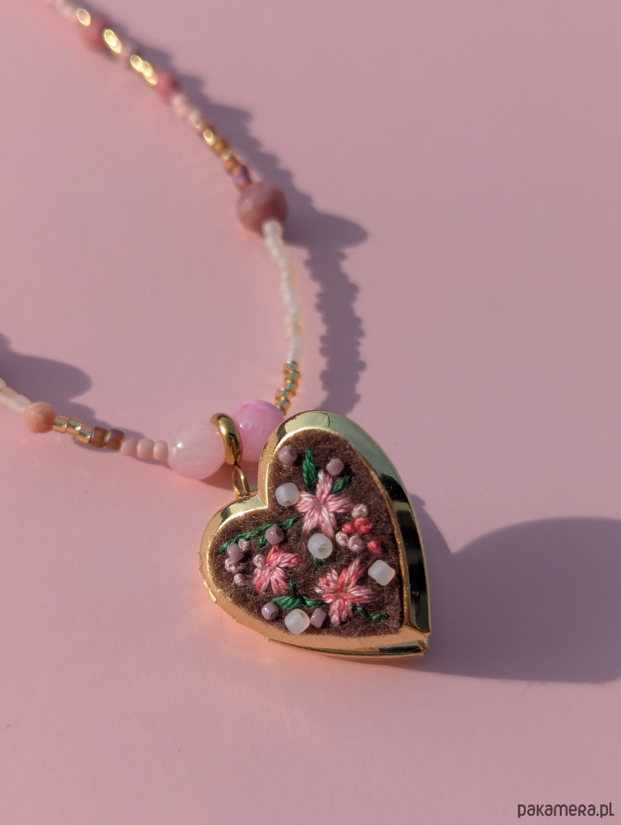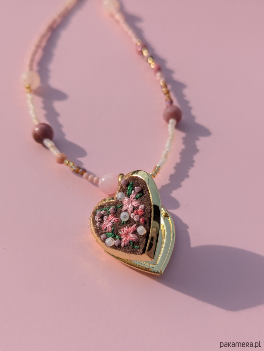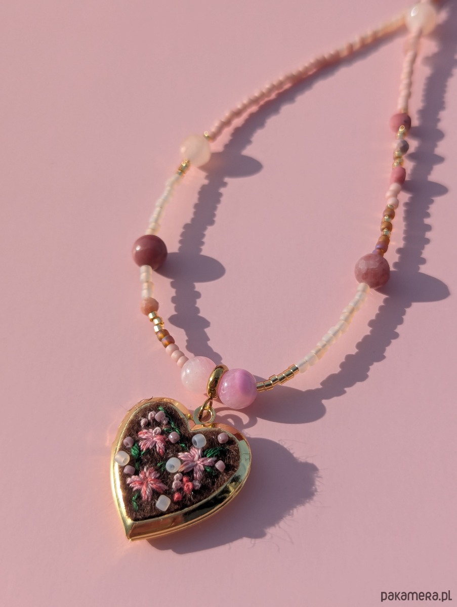 Specjalizuję się w hafcie ręcznym i to właśnie on jest sercem mojej twórczości. Tym razem postanowiłam połączyć moją miłość do haftu z fascynacją koralikami oraz kamieniami naturalnymi. Ręcznie wyhaftowane kwiaty na serduszku-sekretniku spotykają się tu z intuicyjnie nawlekanymi kamieniami i szklanymi koralikami