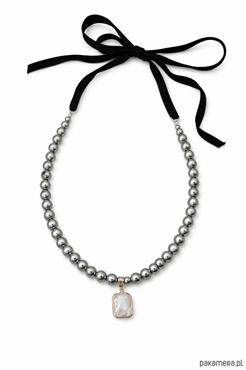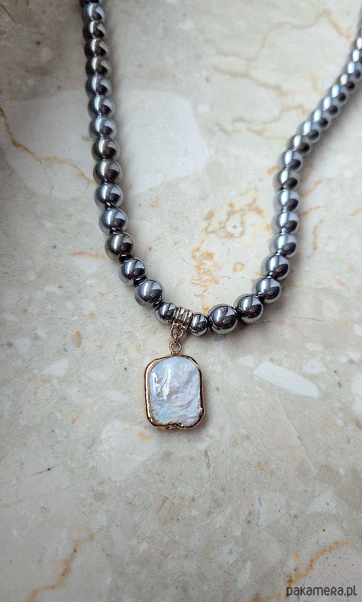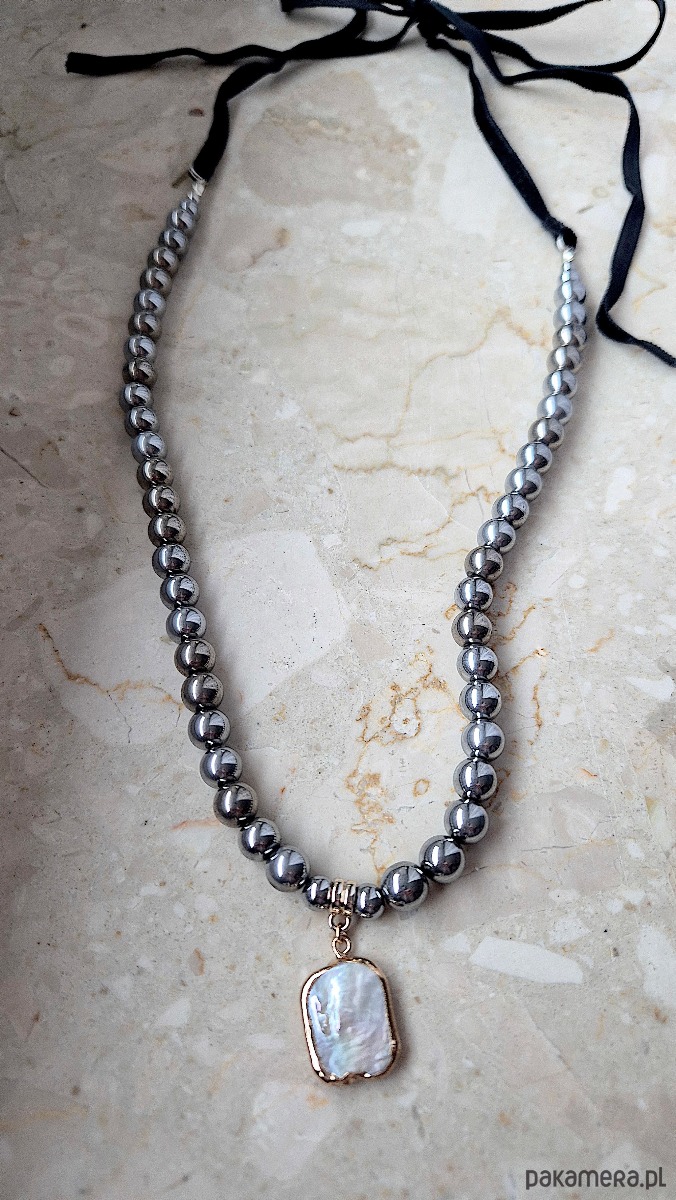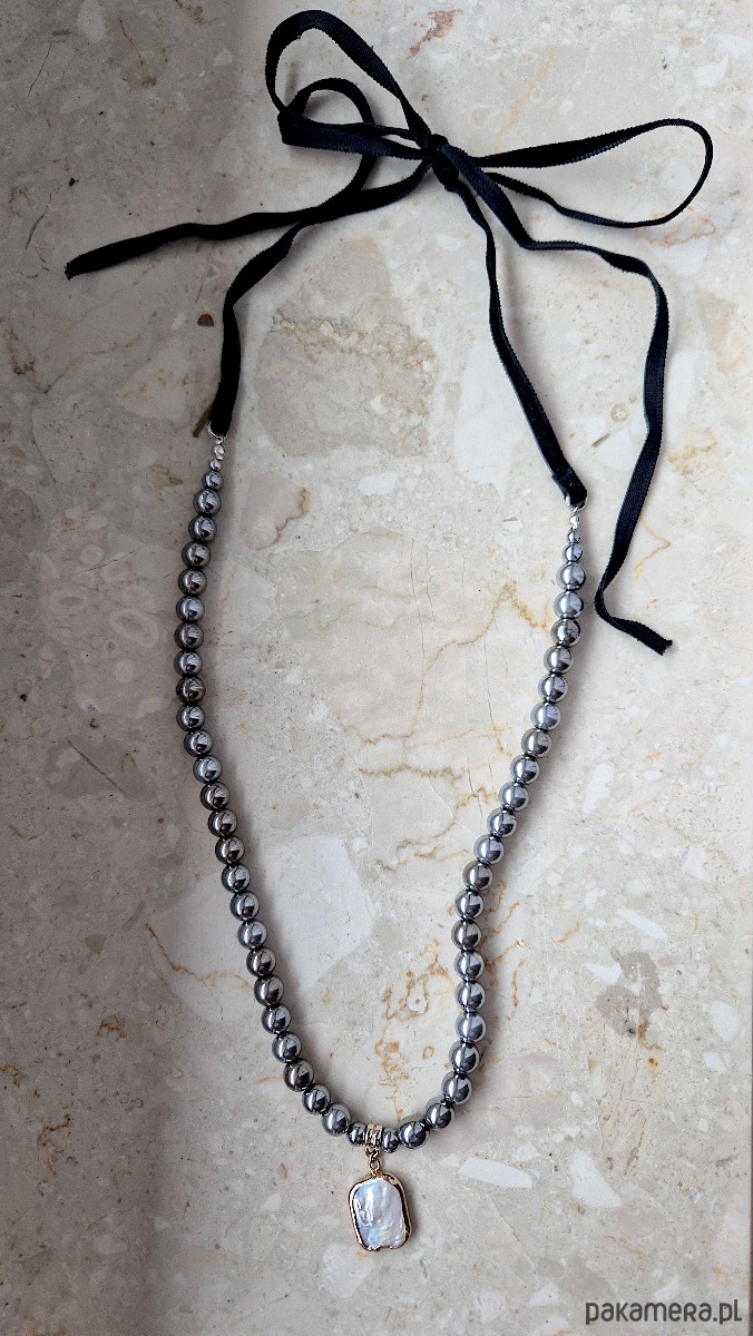 Naszyjnik wykonany ze srebrnych hematytów o średnicy 8mm, ozdobiony perłą w złotej oprawie. Zapięcie regulowane - w formie czarnej aksamitki.