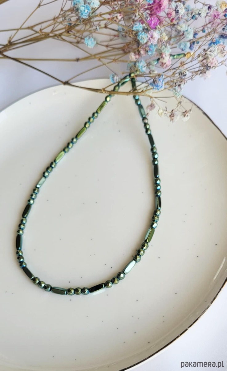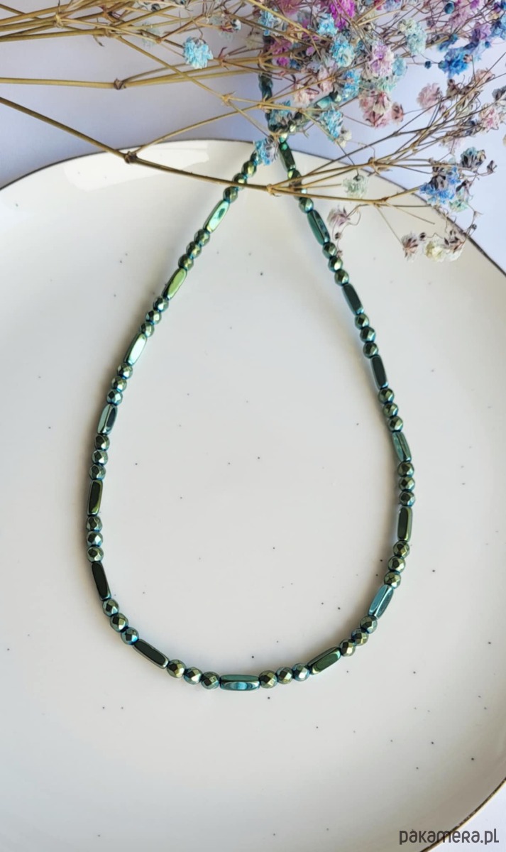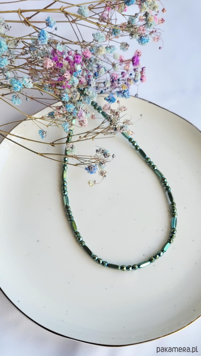Jego metaliczny połysk w odcieniach zieleni pięknie odbija światło, dodając wyjątkowego charakteru zarówno codziennym, jak i wieczorowym stylizacjom. Każdy naszyjnik został wykonany ręcznie, z dbałością o każdy detal.