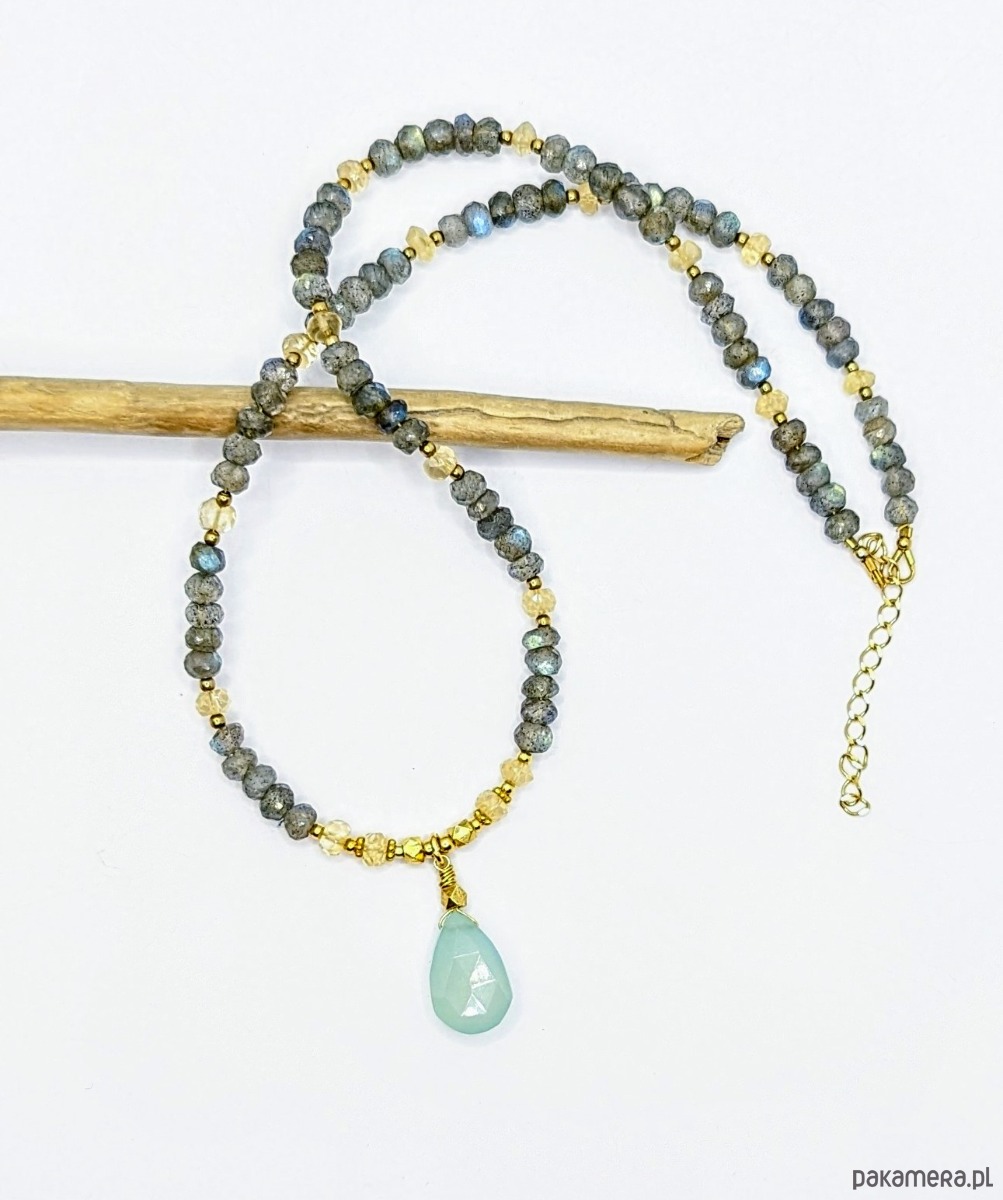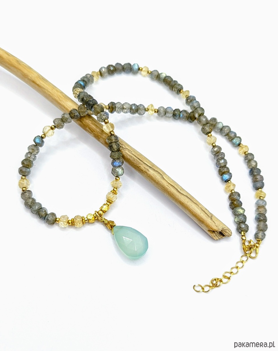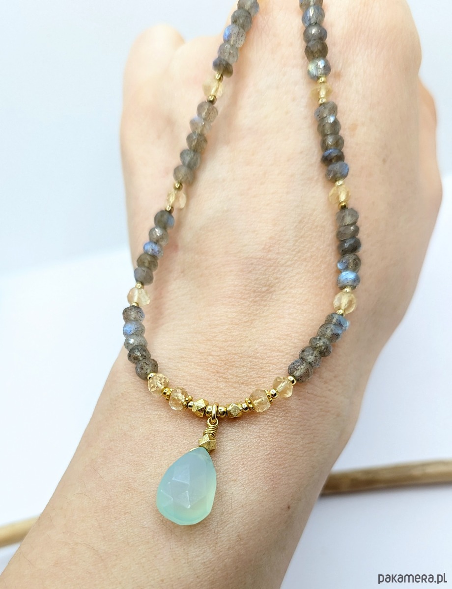 Naszyjnik z opalizującymi labradorytami. Dominuje granatowa i zielono-złota barwa rozświetlająca ten naturalnie szary kamień. Wszystkie dodatki wpisują się w połyskujący styl naszyjnika, a dzięki żółtej barwie cytrynu i pozłacanego srebra budują ciepłą poświatę. Zawieszka z dość dużego kamienia chalcedonu w kolorze aqua jest idealnym dopełnieniem, pięknie układa się na dekolcie.