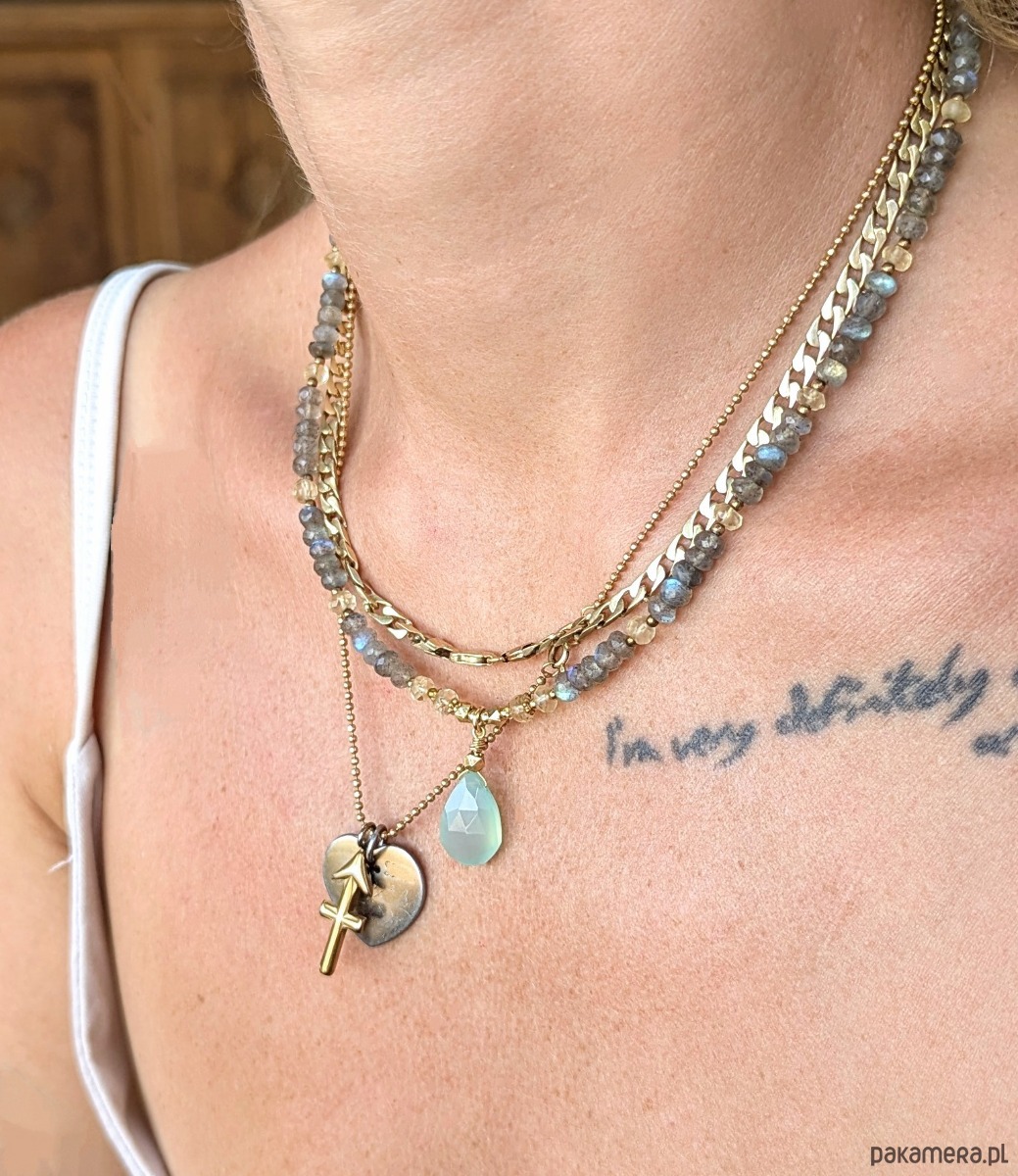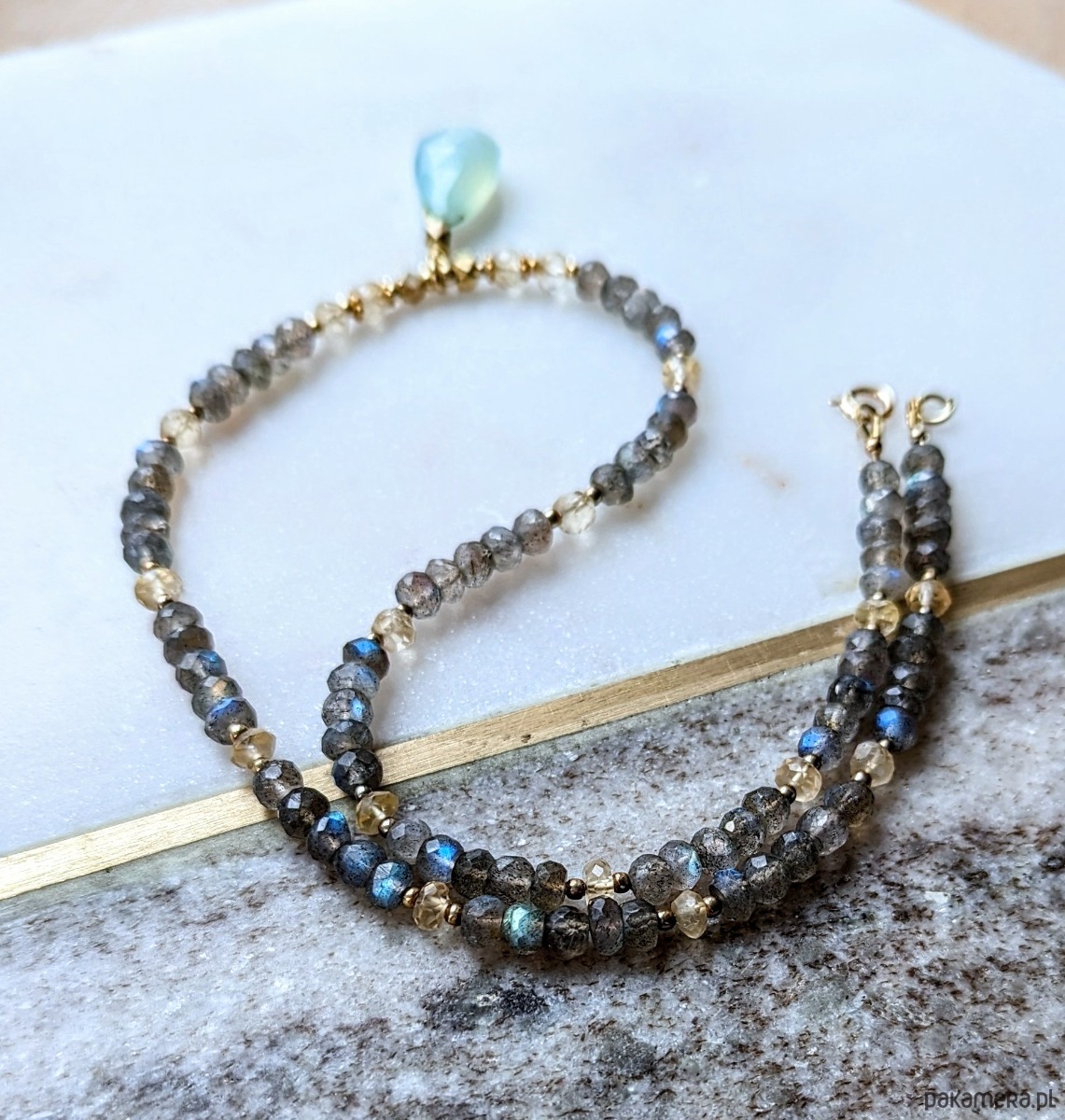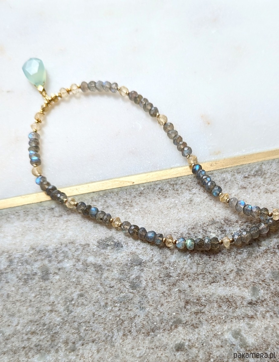Naszyjnik z opalizującymi labradorytami. Dominuje granatowa i zielono-złota barwa rozświetlająca ten naturalnie szary kamień. Wszystkie dodatki wpisują się w połyskujący styl naszyjnika, a dzięki żółtej barwie cytrynu i pozłacanego srebra budują ciepłą poświatę. Zawieszka z dość dużego kamienia chalcedonu w kolorze aqua jest idealnym dopełnieniem, pięknie układa się na dekolcie.
