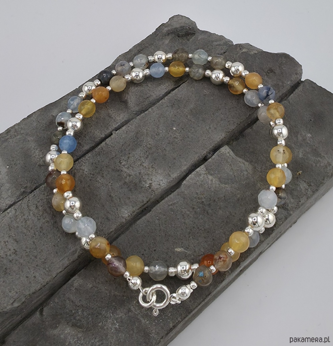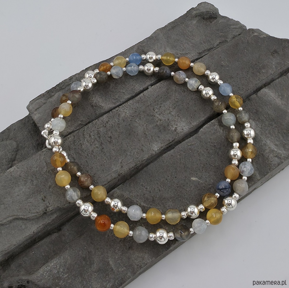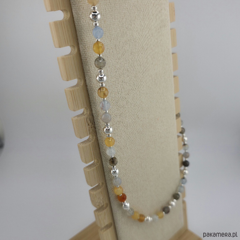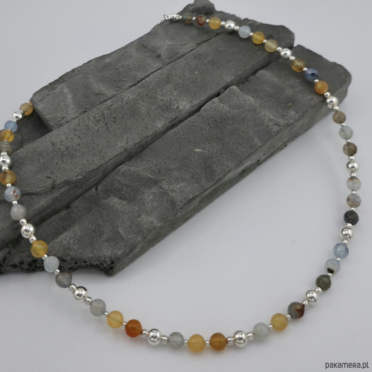 Prosty, minimalistyczny naszyjnik na co dzień i nie tylko. Wykonany w całości ze srebra próby 925 oraz fasetowanych kulek jadeitu w kilku odcieniach wielkosci 0,6 cm. Obwód naszyjnika to 50 cm. Na życzenie mogę obwód delikatnie zmienić lub dodać przedluzke. Jeden z dwoch egzemplarzy. Ozdobnie zapakowany.