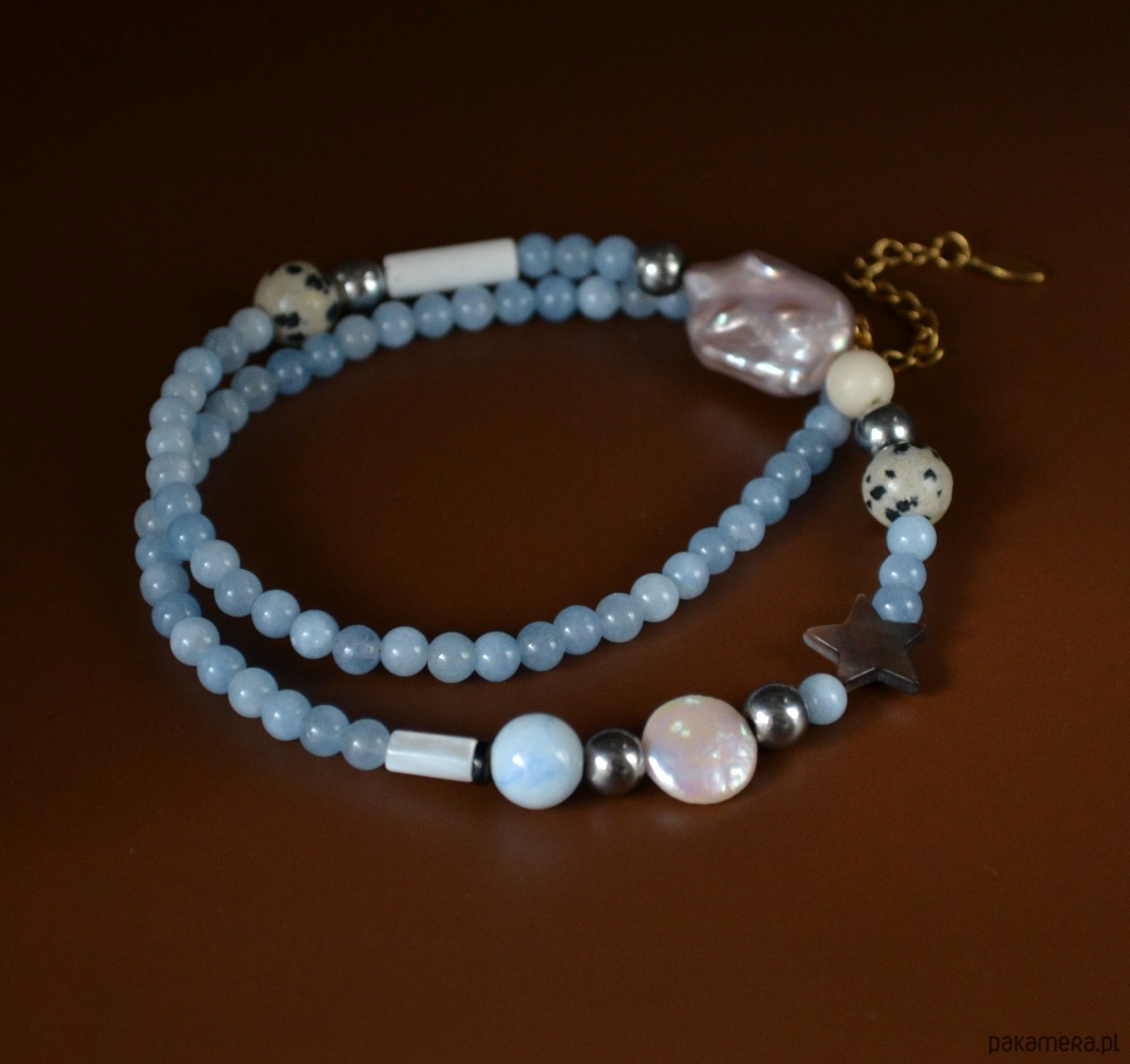 Został wykonany z okrągłych jasno błękitnych jadeitów, różowej perły, białej perły, jaspisu dalmatyńskiego, kamieni rzecznych, srebrnych hematytów, masy perłowej.