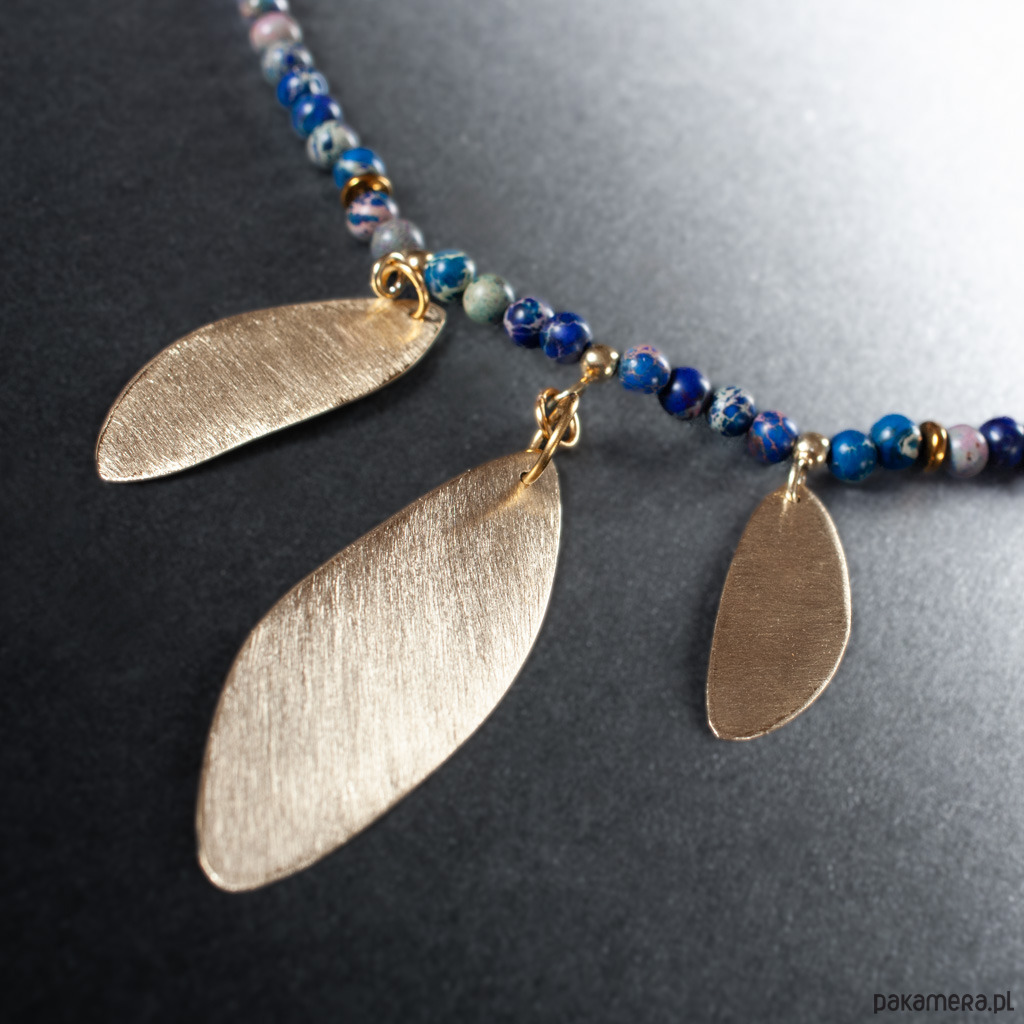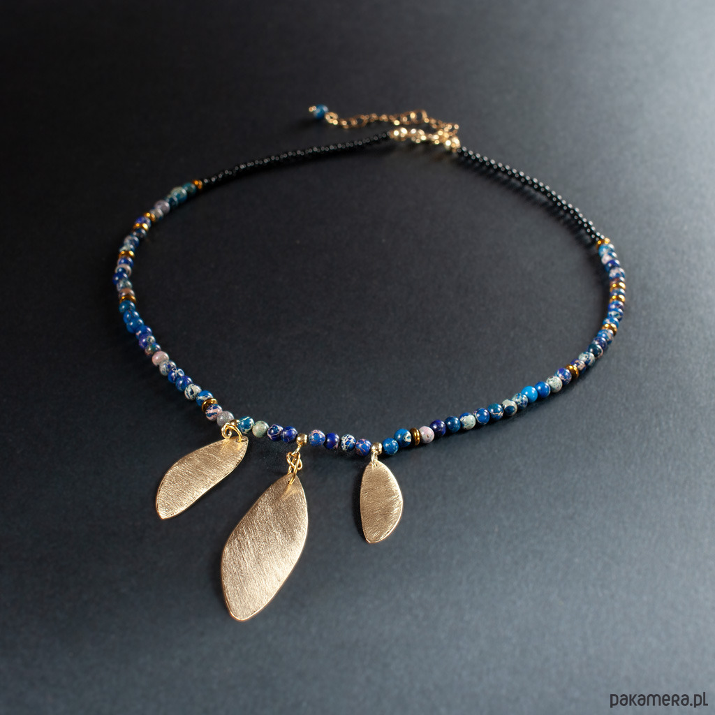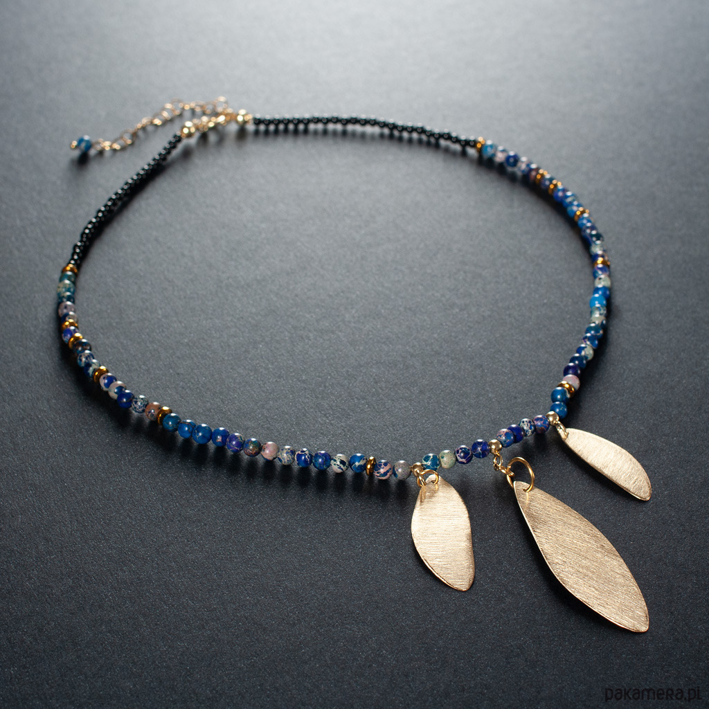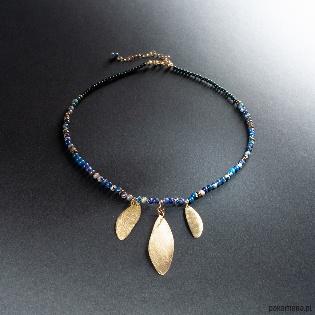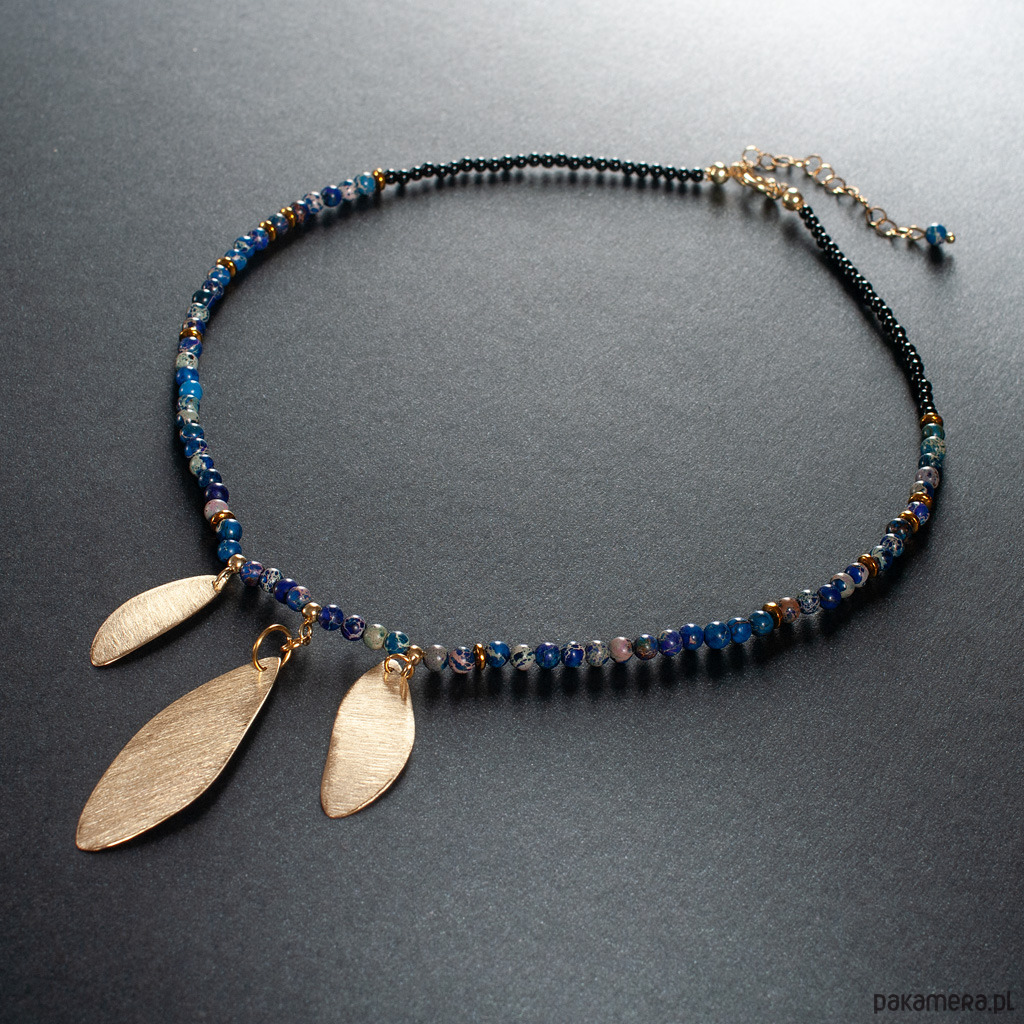 Naszyjnik z jaspisem cesarskim, onyksem, hematytem i mosiądzem. [WK8]