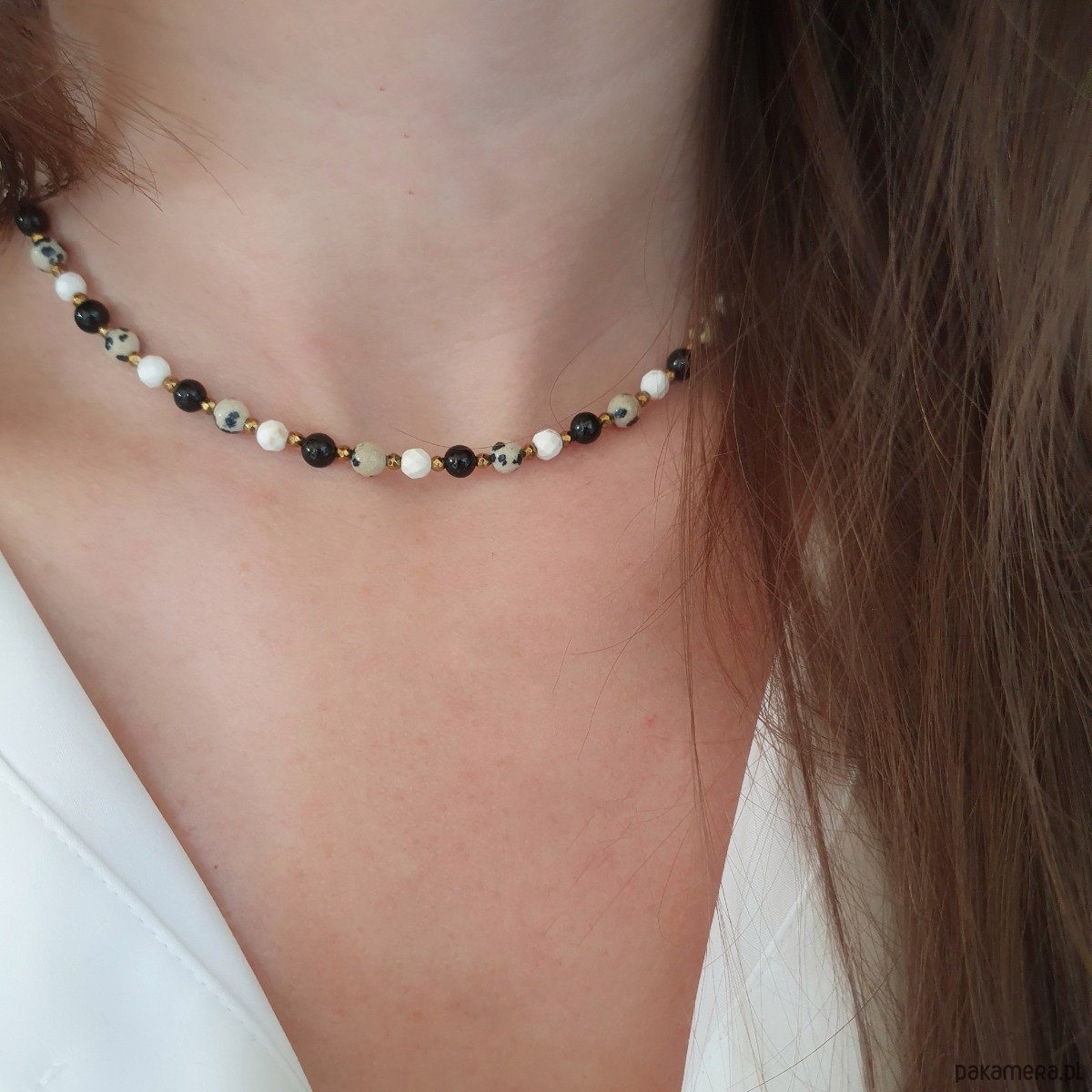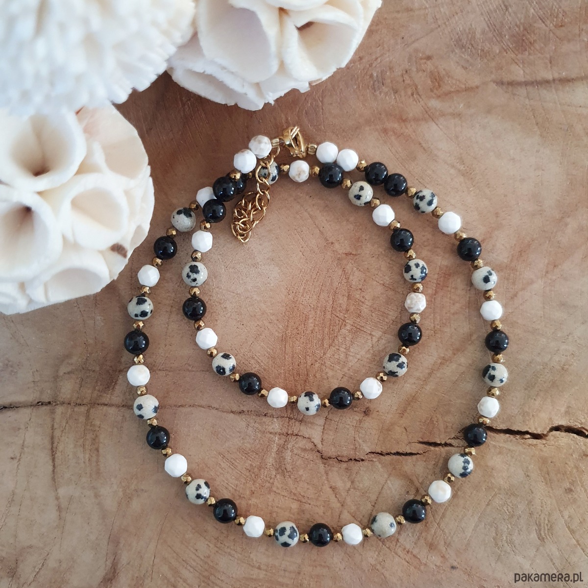 Naszyjnik wykonany z kamieni naturalnych: czarnego turmalinu, magnezytu, jaspisu dalmatyńskiego i złotego hematytu na wytrzymałej lince jubilerskiej. Wykończony antyalergiczną stalą szlachetną.