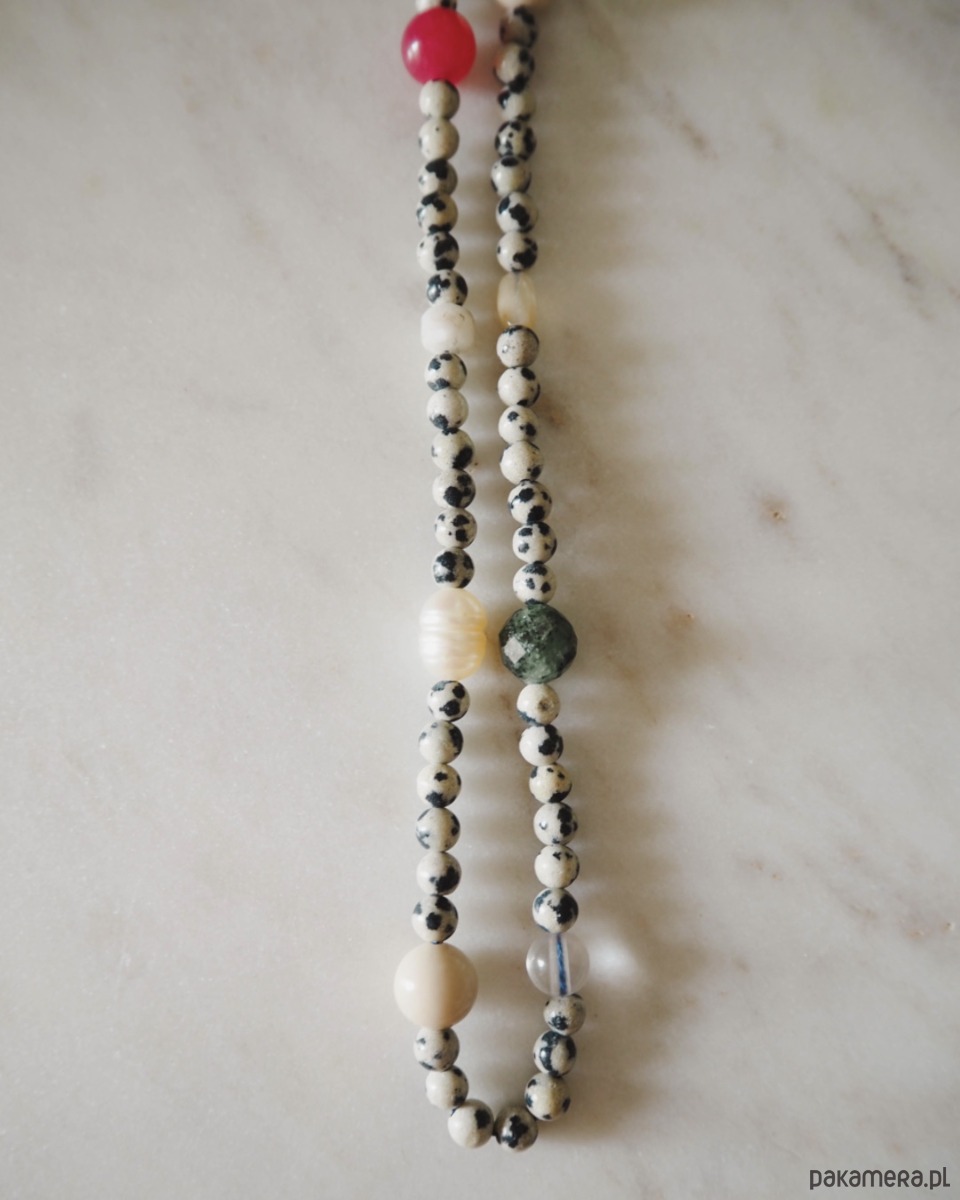Naszyjnik z łaciatych kamieni jaspis dalmatyński przeplatany kamieniami w różnych kolorach i wielkościach. Wyjątkowy choker, który ożywi Twoje stylizacje.