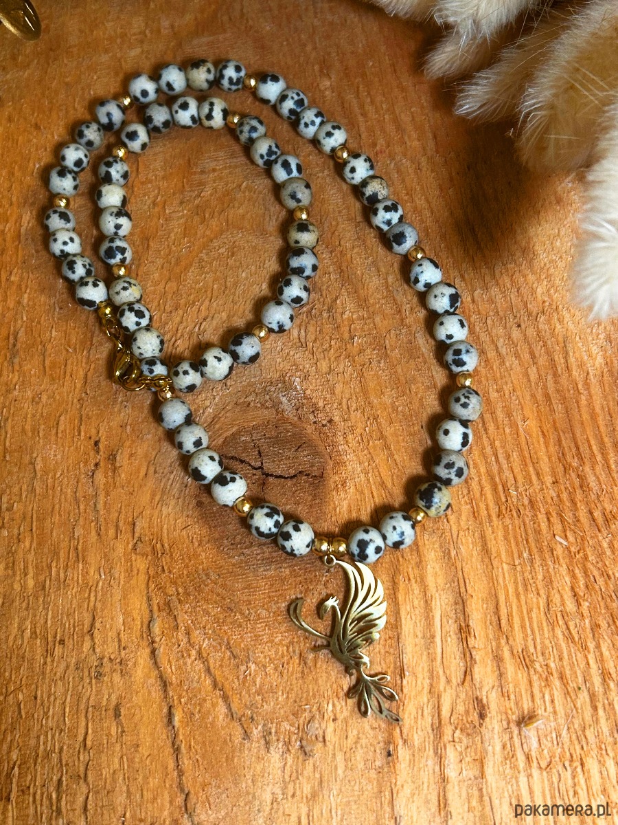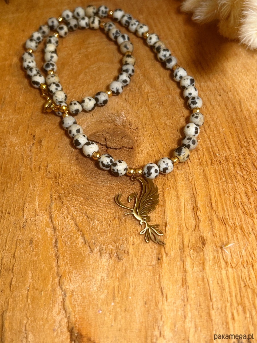 ✨ Naszyjnik z jaspisu dalmatyńskiego, hematytu i złotej zawieszki feniksa – symbol odrodzenia, siły i nowych początków