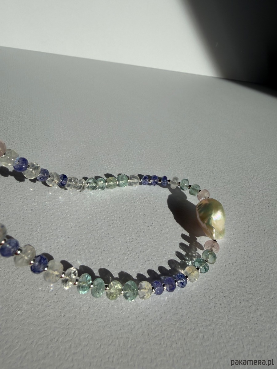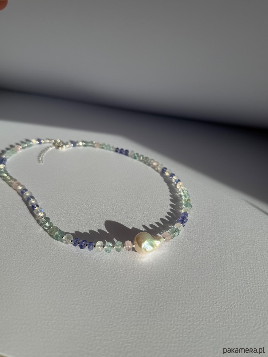 Naszyjnik z perłą, tanzanitem, morganitem i kamieniem księżycowym.