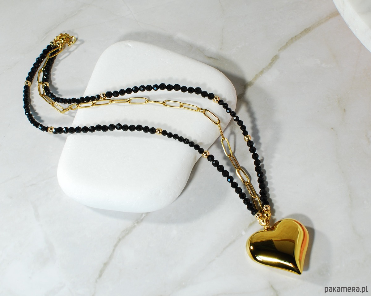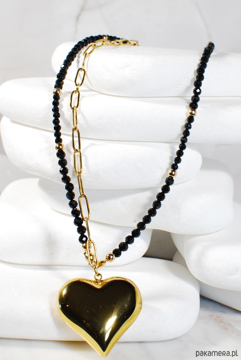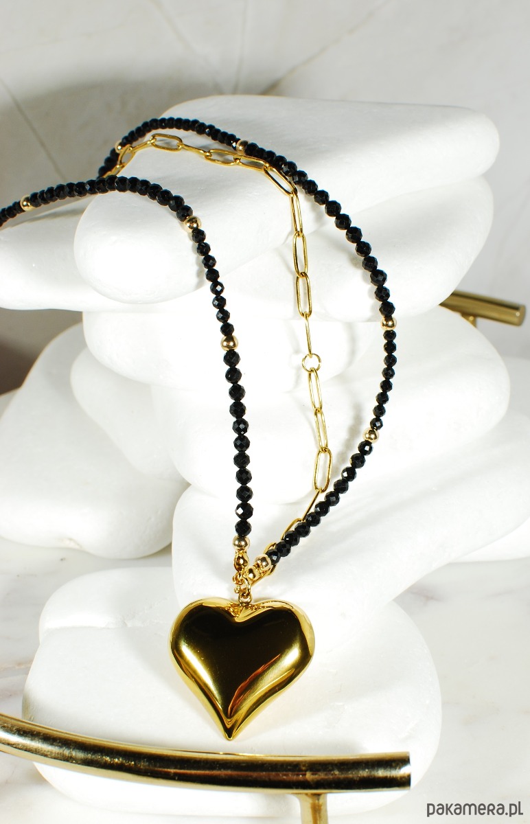 Centralnym elementem jest duże pozłacane serce, które kontrastuje z czarnymi kamieniami i nadaje biżuterii zdecydowanego, designerskiego wyrazu.