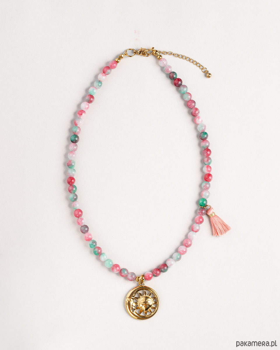 Naszyjnik z kamieni i jedwabiu z zawieszką Słonce Księżyc