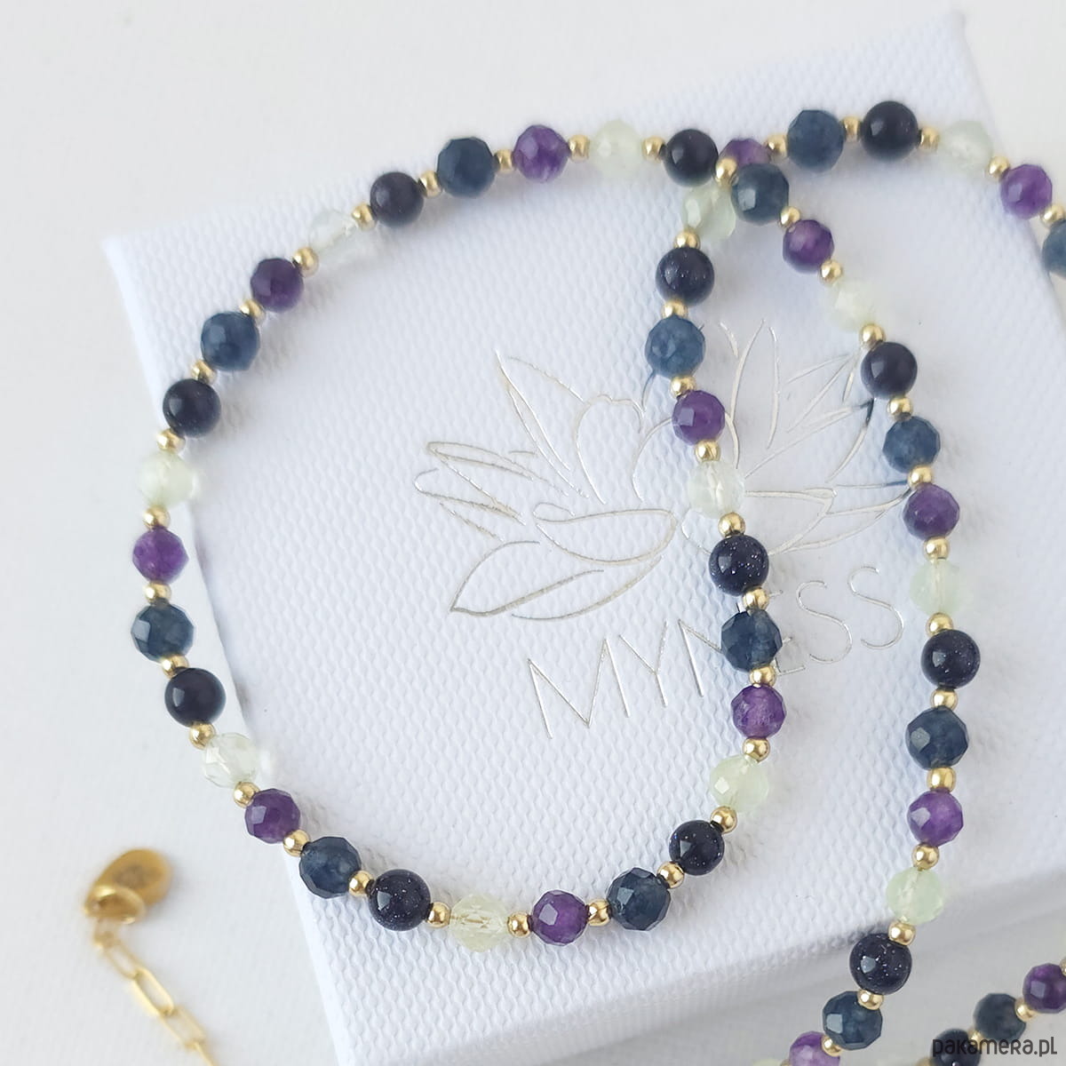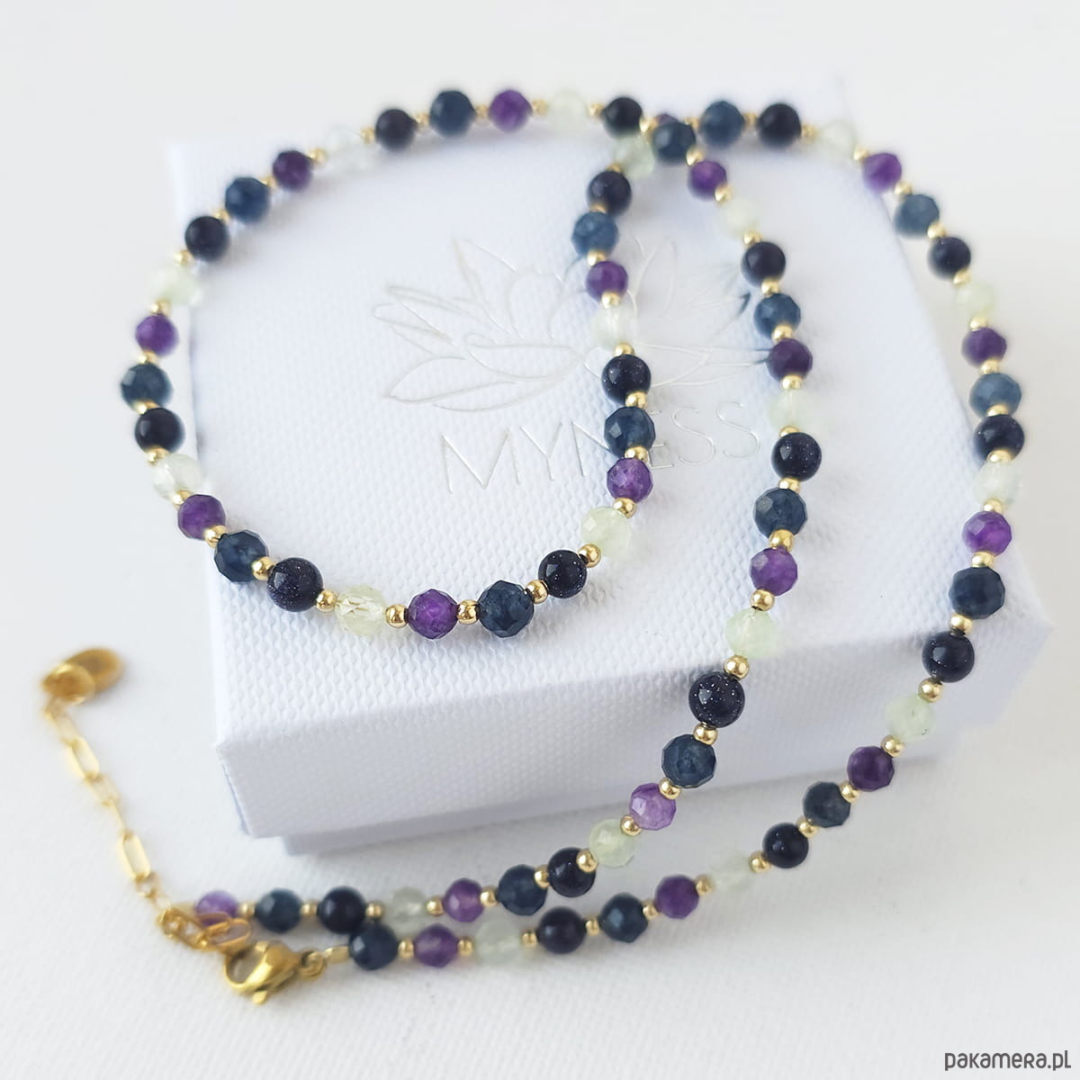 Elegancki i niepowtarzalny naszyjnik wykonany z naturalnych kamieni szlachetnych i półszlachetnych, wykończony elementami ze stali szlachetnej.