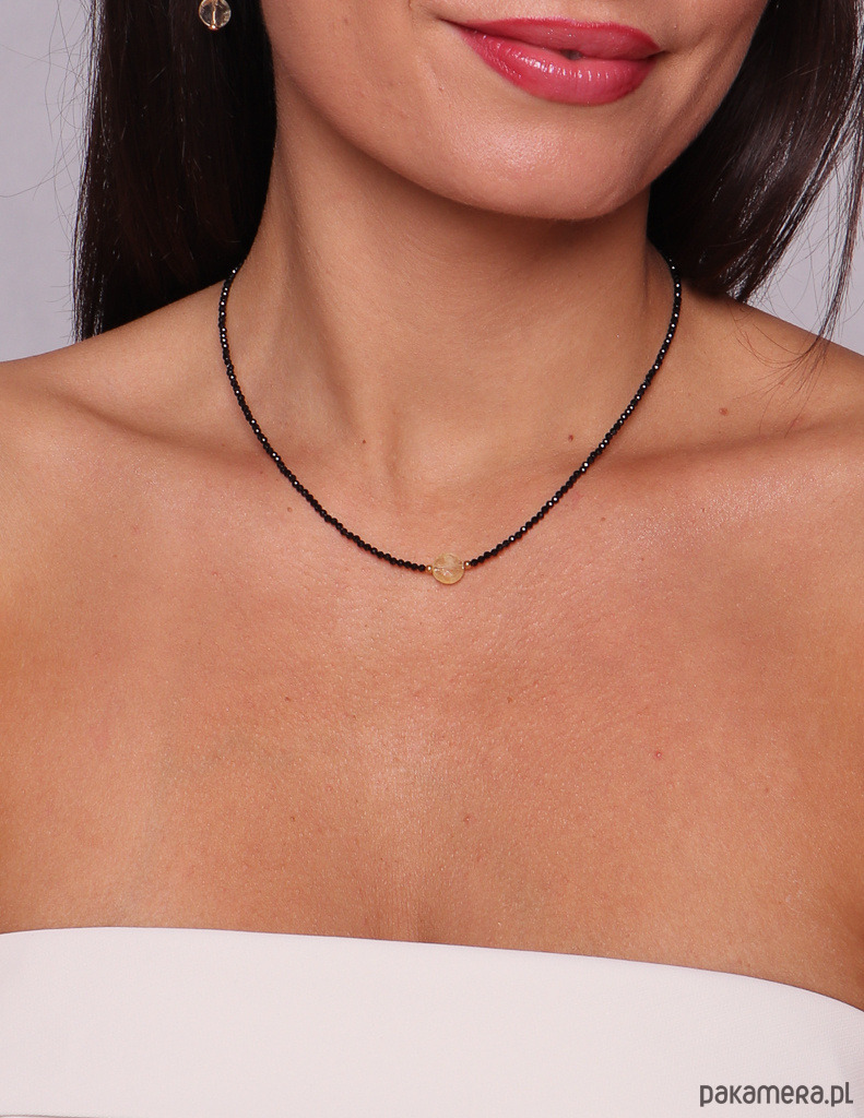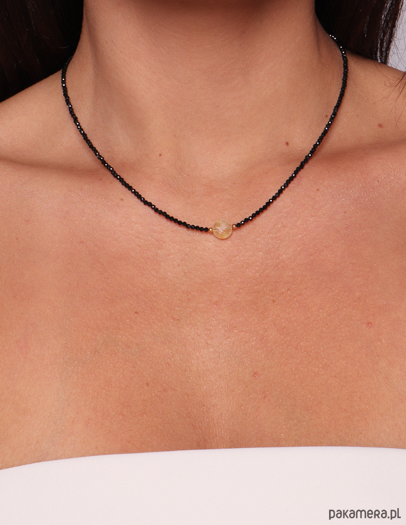 Delikatny, minimalistyczny naszyjnik wykonany z drobnych, fasetowanych kamieni czarnego turmalinu, wykończony efektowną zawieszką w formie dysku z naturalnego cytrynu. To elegancki talizman, który łączy moc ochrony z energią dobrobytu i pozytywnego działania.