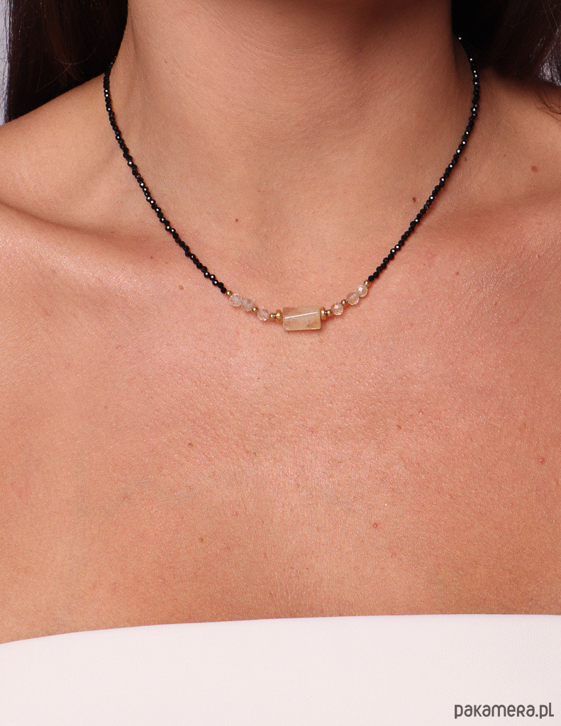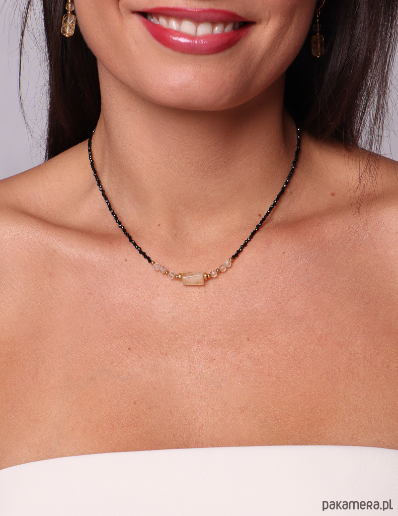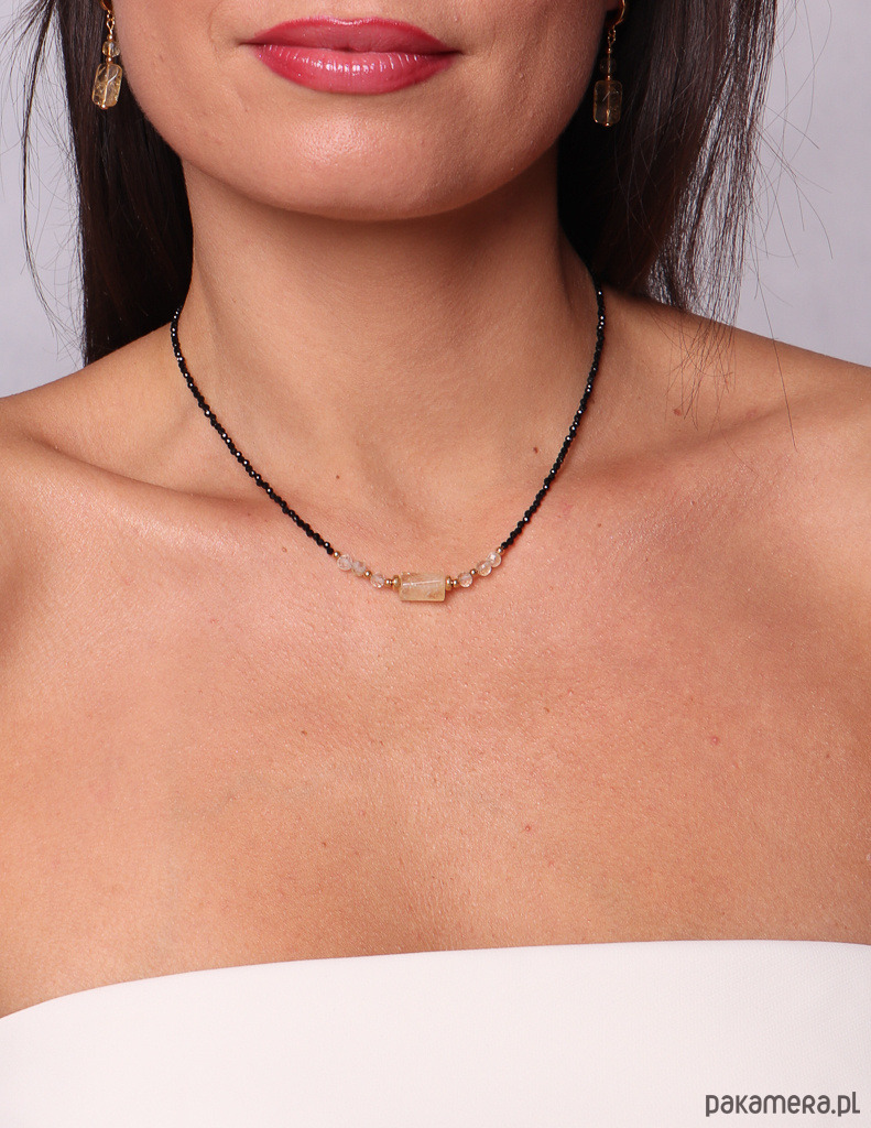 Delikatny, a jednocześnie pełen energii naszyjnik wykonany z drobnego czarnego turmalinu, naturalnych fasetowanych cytrynów oraz pozłacanych hematytów. W centrum znajduje się ręcznie oprawiona belka z cytrynu, która pięknie rozświetla całość.