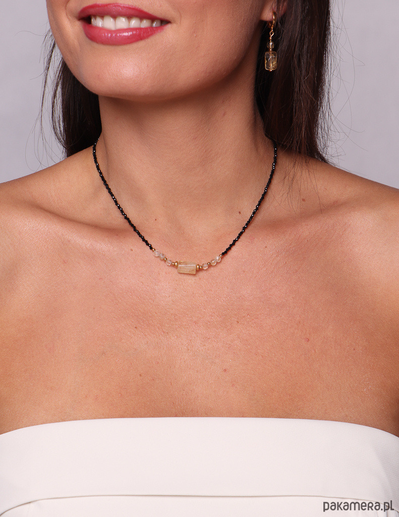 Wielkość kamieni: hematyt 2 mm, czarny turmalin 2 mm, cytryn 4 mm, cytryn belka 7x12 mm Kolor: żółty, złoty, czarny