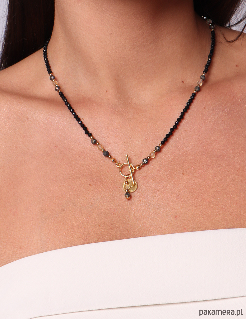 Naszyjnik z czarnego turmalinu, cytrynu i pirytu to wyjątkowy talizman ochrony i obfitości, wykonany ręcznie z naturalnych kamieni i wykończony złoconymi detalami. Czarny turmalin dodaje klasy i głębi, cytryn wprowadza subtelny blask, a piryt nadaje całości elegancji o mineralnym charakterze. Delikatne przekładki z hematytu podkreślają linię naszyjnika i dodają mu nowoczesnego, biżuteryjnego wykończenia.To idealny wybór na co dzień i do stylizacji, które mają przyciągać uwagę minimalistyczną, energetyczną biżuterią. Naszyjnik pięknie układa się na dekolcie i jest doskonałym prezentem dla osób ceniących talizmany z przesłaniem.