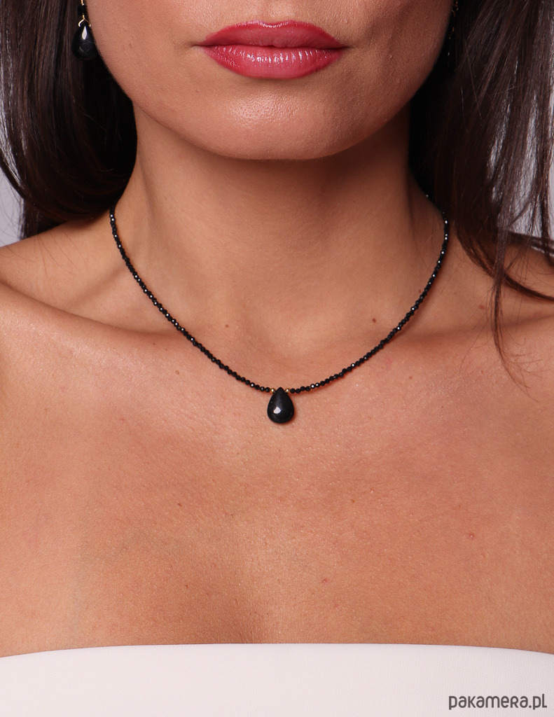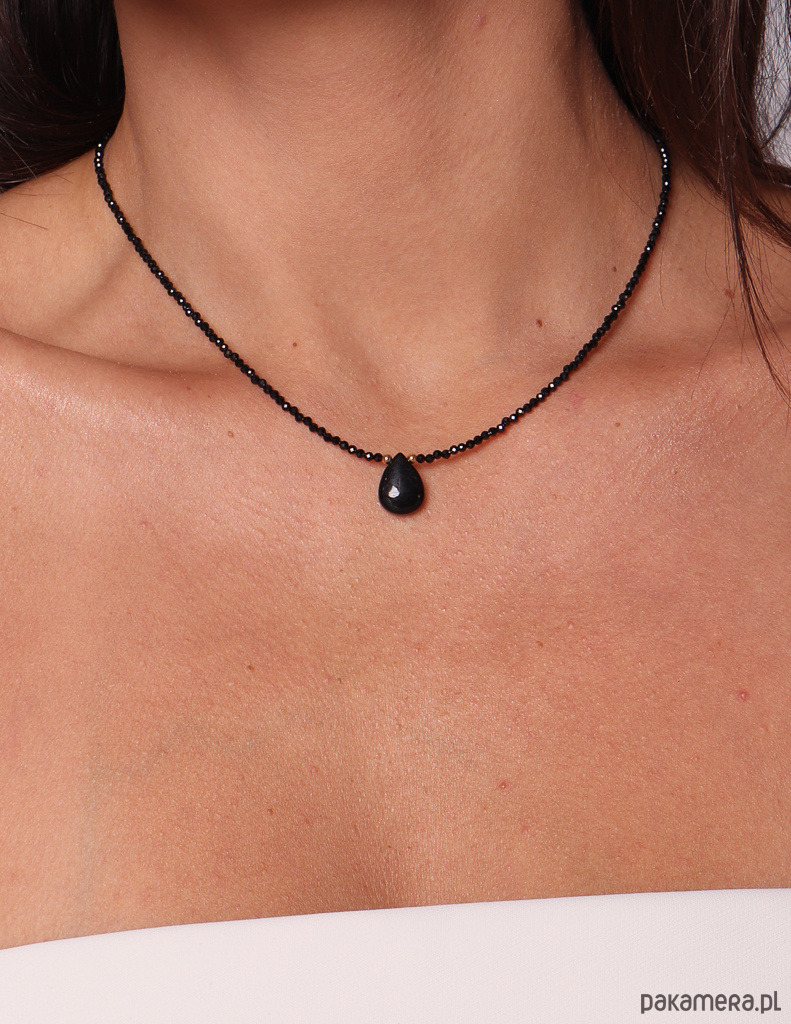 Minimalistyczny, elegancki naszyjnik wykonany z drobnych, fasetowanych kamieni czarnego turmalinu oraz złoconego hematytu, wykończony efektowną zawieszką w kształcie łezki z naturalnego turmalinu. To prosty, ale niezwykle silny energetycznie talizman ochronny.