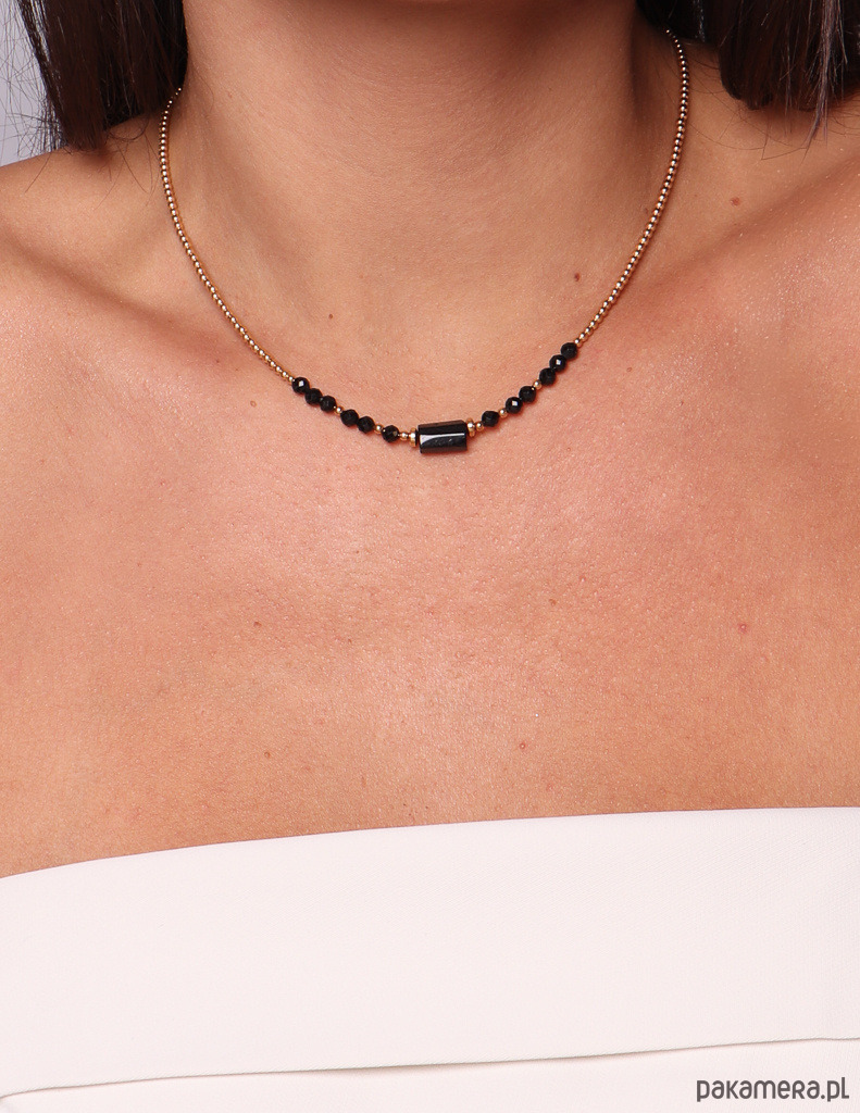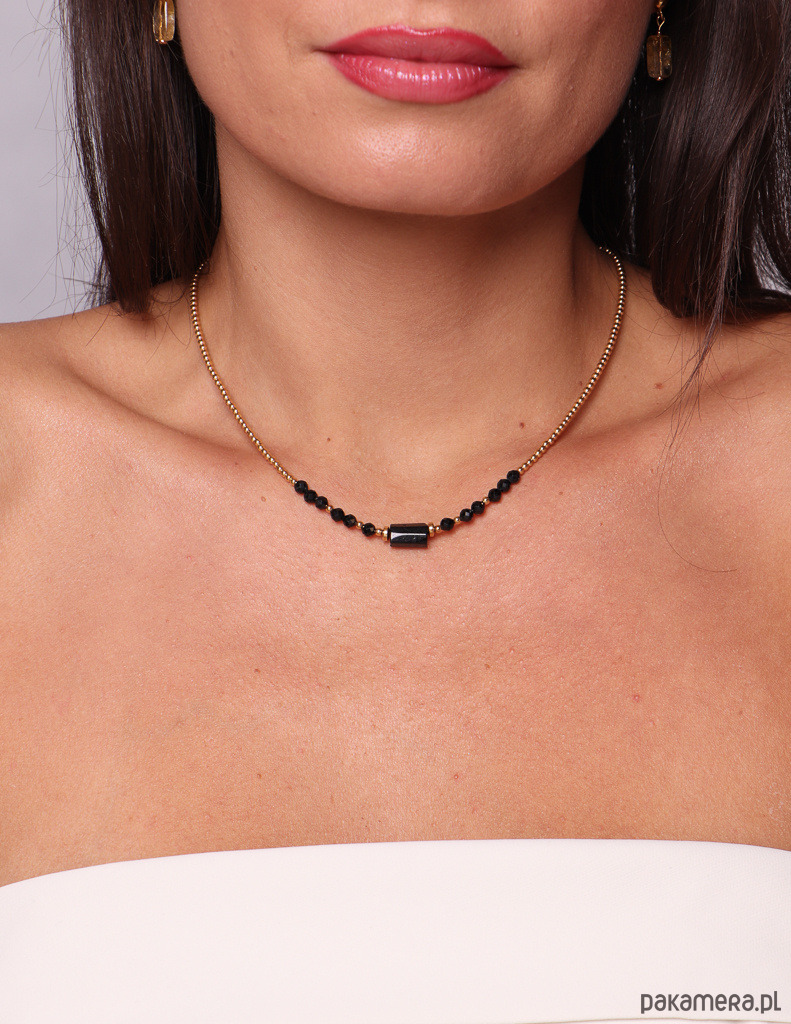 Minimalistyczny naszyjnik wykonany z drobnych, złoconych kamieni hematytu, uzupełniony centralnym akcentem z czarnego turmalinu w formie energetycznej belki oraz fasetowanych kulek. To nowoczesny, subtelny talizman stworzony do codziennego noszenia.