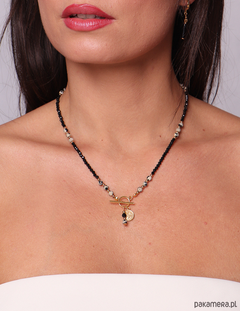 Cechy produktuKamień: czarny turmalin, jaspis dalmatyński, hematytWielkość kamieni: ok. 3 mm, 4 mmKolor: złoty, beżowy, czarny