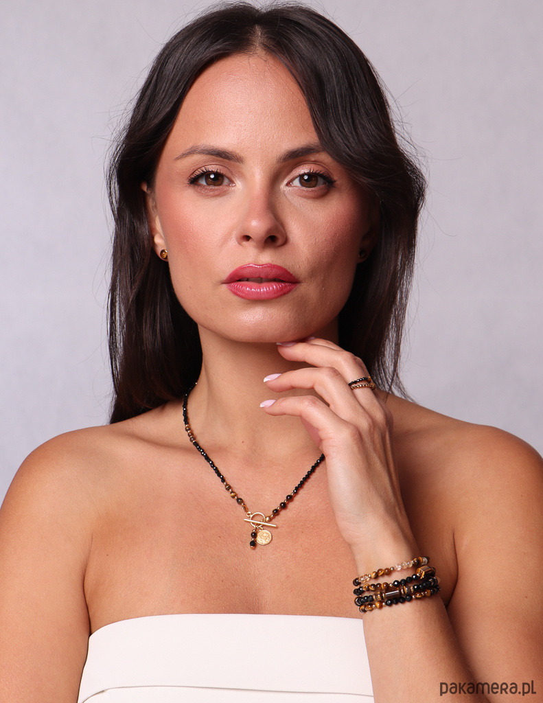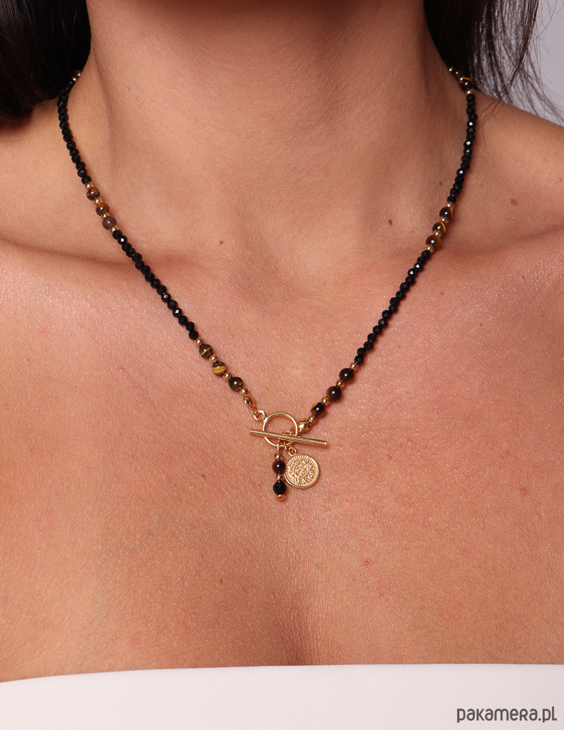 Naszyjnik Talizman Ochrony i Odwagi z czarnego turmalinu, tygrysiego oka i hematytu to mocna, energetyczna biżuteria stworzona dla osób, które chcą wzmocnić poczucie bezpieczeństwa, pewność siebie i wewnętrzną siłę. Połączenie fasetowanego czarnego turmalinu z energetycznym tygrysim okiem tworzy harmonijny amulet, który wspiera ochronę przed negatywną energią i dodaje odwagi w codziennych decyzjach. Delikatny hematyt podkreśla elegancję całego projektu i pomaga zachować równowagę emocjonalną. Centralne zapięcie typu toggle z pozłacaną zawieszką dodaje nowoczesnego charakteru, sprawiając, że naszyjnik jest zarówno talizmanem, jak i wyjątkową ozdobą.
