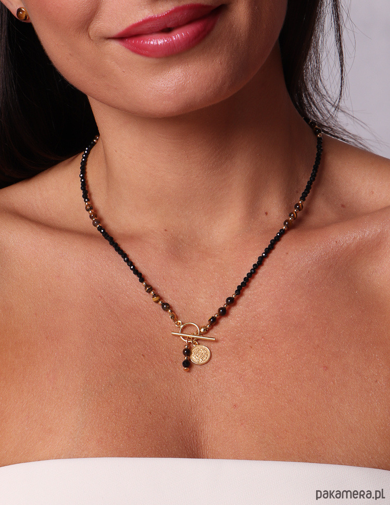 Cechy produktuKamień: czarny turmalin, tygrysie oko, hematytWielkość kamieni: ok. 3 mm, 4 mmKolor: złoty, granatowy, czarny