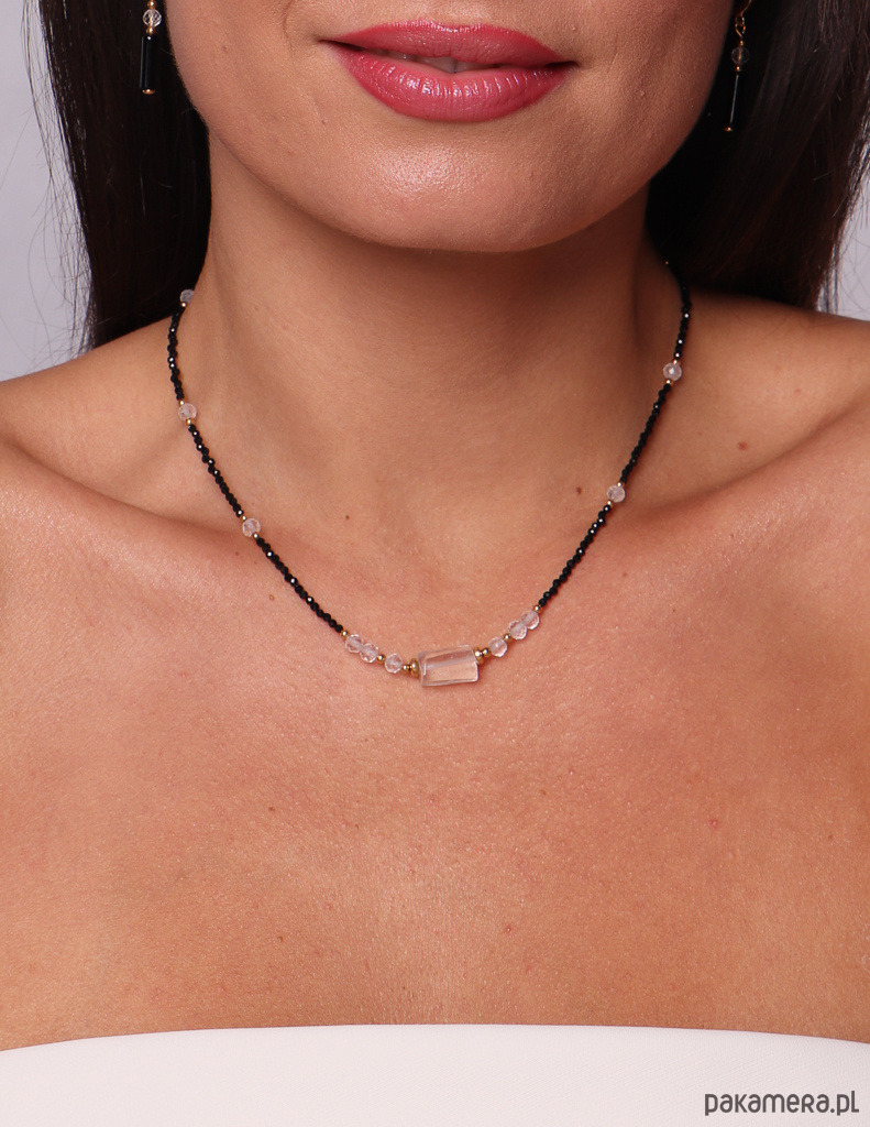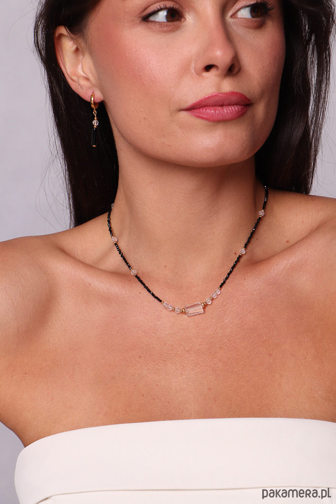Delikatny naszyjnik wykonany z fasetowanego czarnego turmalinu, rozświetlony transparentnym blaskiem kryształu górskiego i uzupełniony złocistymi akcentami hematytu. To subtelna, a jednocześnie energetyczna biżuteria, która łączy w sobie ochronę, klarowność myśli i siłę wewnętrzną.
